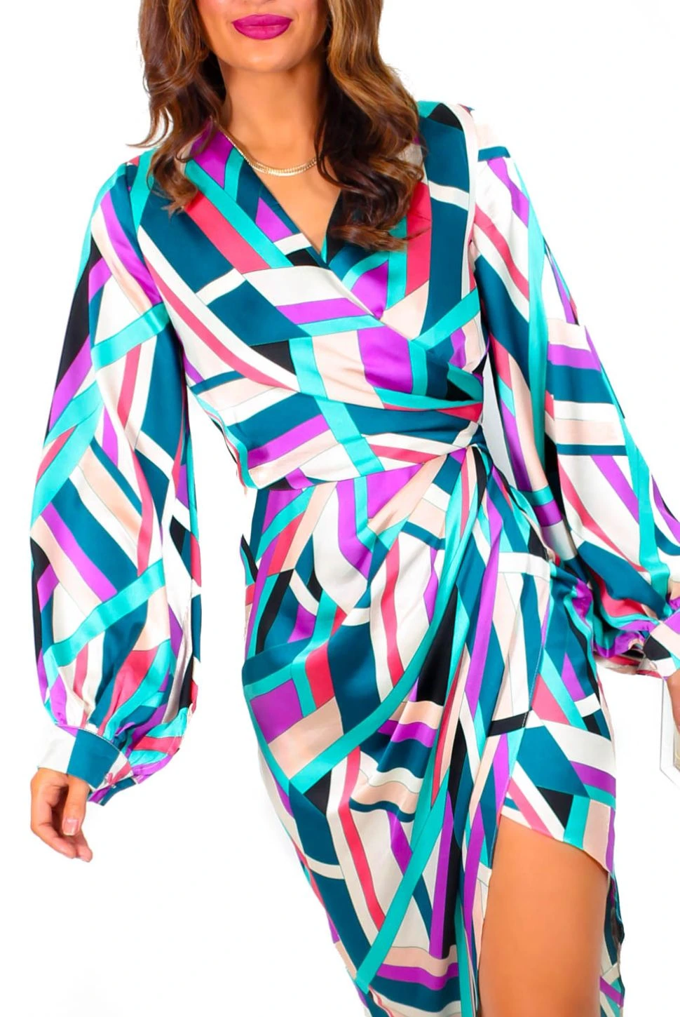 Add an extra touch of class to your going out out wardrobe this season! This stunning midi length dress boasts an abstract print in shades of turquoise, pink, white and purple, has a wrap style v-neckline, long cuffed sleeves and an asymmetric hemline for the best balance of sassy and classy. Match your accessories to your fav’ colour in the print and get browsing the cocktail menu – we’ll have a passionfruit martini please!