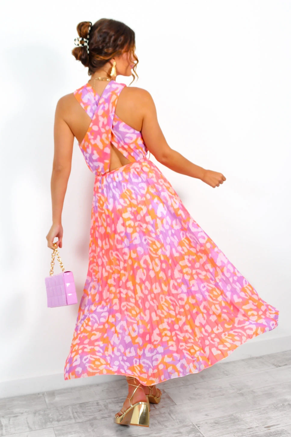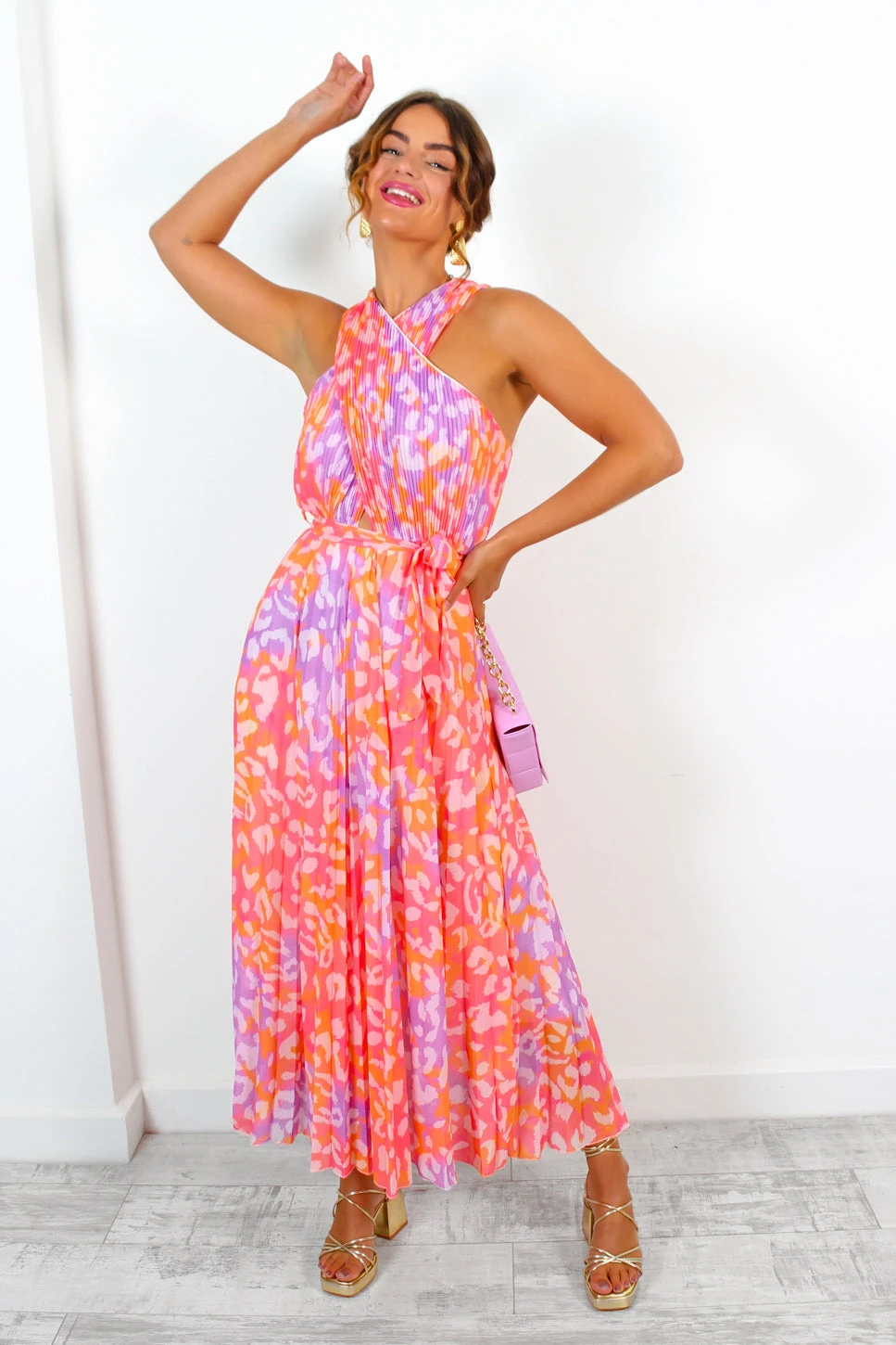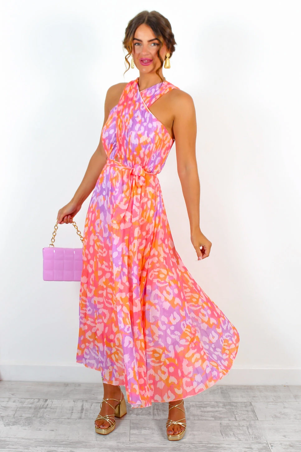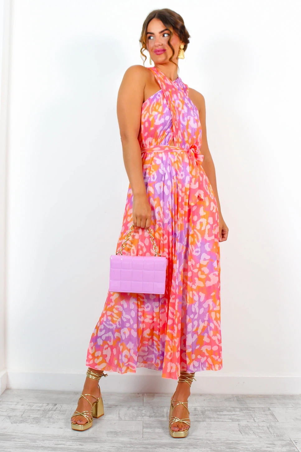 We love a lil animal print, Doll! This fierce and sophisticated halter neck maxi dress features a showstopping fuchsia and orange animal print in an all-over pleated fabric. A swishy draped maxi skirt, cross-over bust, and a matching tie belt complete the sassy silhouette. Make your special event ensemble pop with pink and orange accessories, or go full Goddess-mode with with a touch of gold sparkle for those sweltering Spring/Summer weddings!