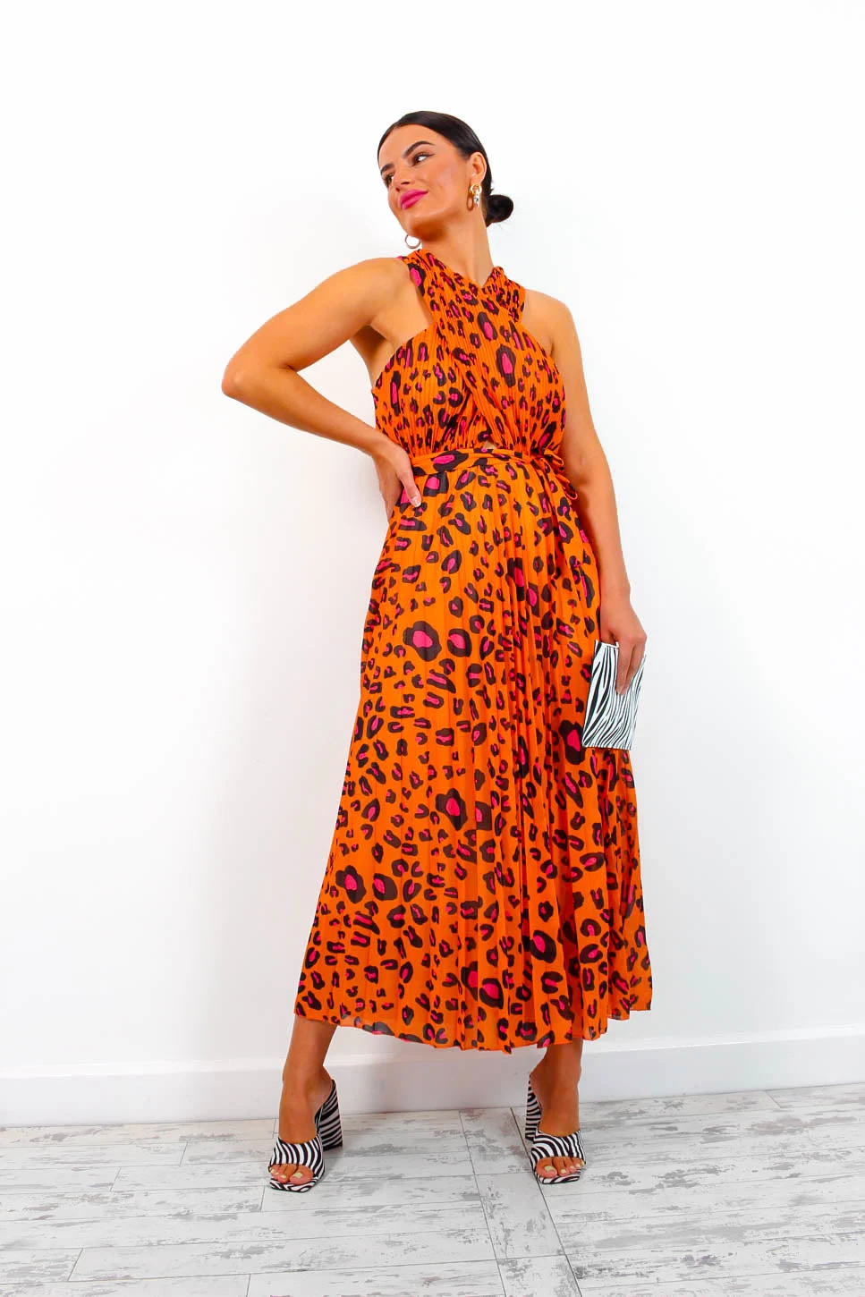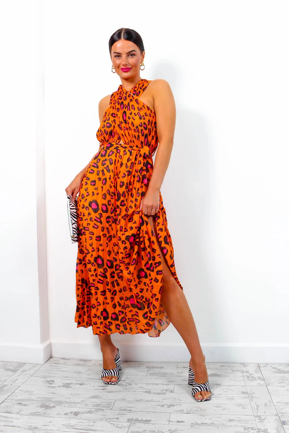 What a colour combo! We love mixing a little class with some edge and this dress is the perfect concoction of both. This stunning maxi dress features an orange and fuchsia leopard print, a cross-over detail neckline, an empire waistline, and a tie belt to shape. Any accessories will look perffff just remember to bring that attitude.