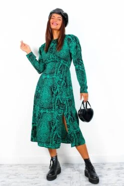 They’re all here for you! Make an entrance in this stunning green patterned midi dress. Featuring a gorgeous forest green and black paisley print, long sleeves, a rounded neck, and a flowing hemline with flirty side leg split. Pair with a green heel and bag combo for a perfectly put-together look.