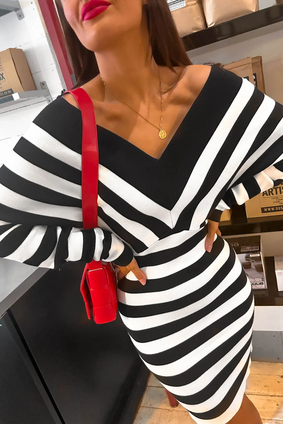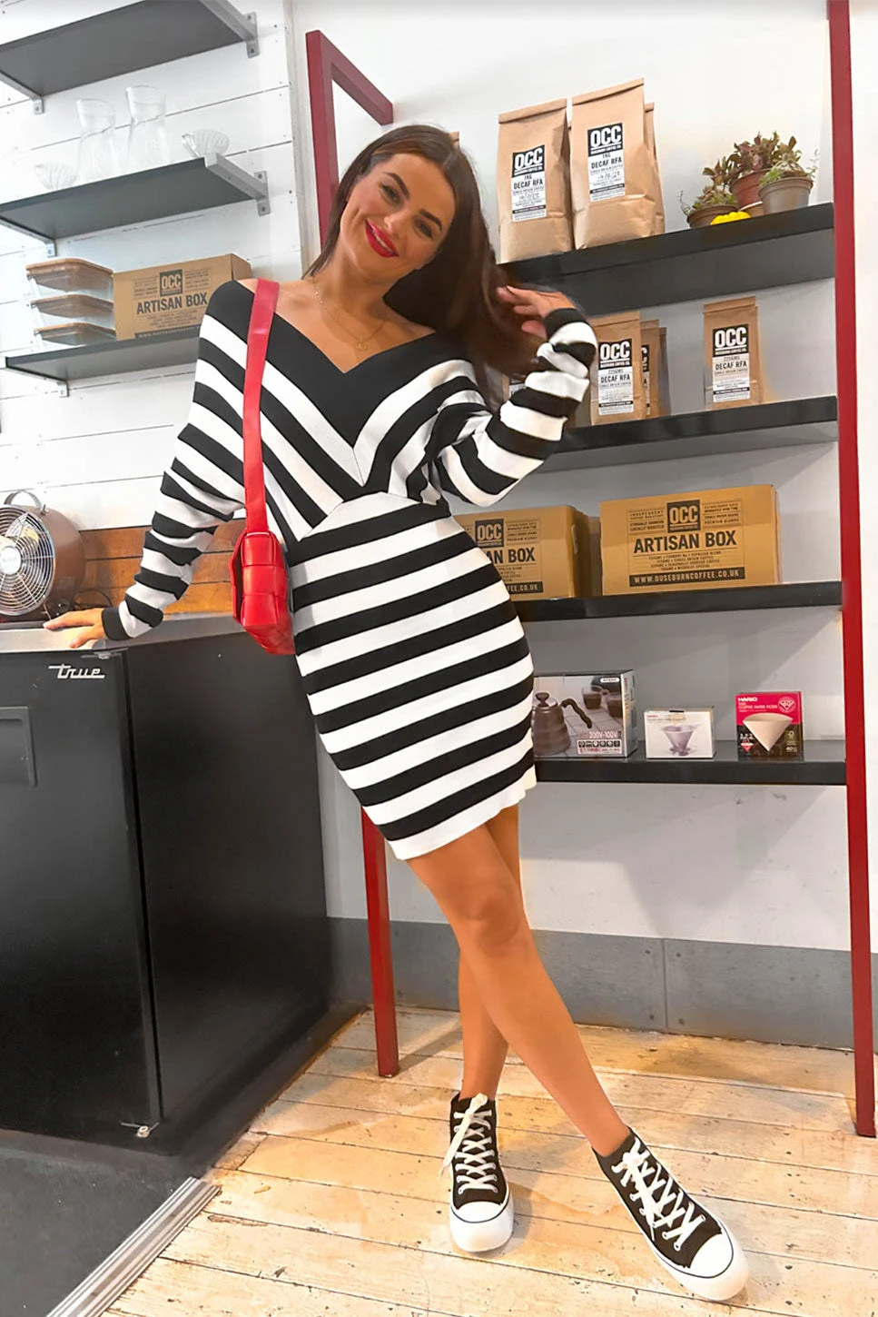 Belle âme, which translates to a beautiful soul… and beautifully dressed! In an ever so Parisian style, this cosy knitted jumper dress features black and white vertical stripes throughout, a plunged v-neckline and long sleeves to keep you stylish but warm in those colder months. Style with a
