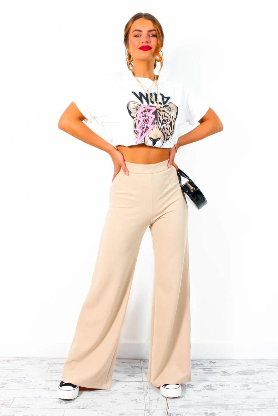 Crushing on neutrals! Get out there, Doll, and make the day your b*tch with these versatile stone wide leg trousers. Featuring that iconic palazzo pants style; flatteringly fitted at the waist and flowing into a wide trouser. These fashion-forward must-haves can take any fit from fine to fabulous! Pair with a white corset style top, chunky white sandals and gold jewellery for a fresh look that gets heads turning.