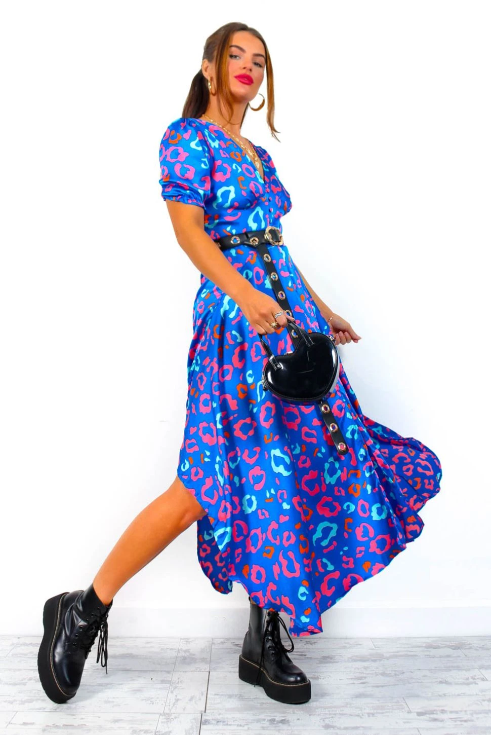 Unleash your inner wild side, Doll – you were born that way! In a floaty satin material, this midi is perfect for releasing your wild side without compromising on style or comfort. Blue throughout with shades of pink and orange leopard print, this dress is complete with short puffed sleeves and a dreamy flowing hemline. Look and feel fierce and fabulous in your highest pink heels as you hit the town.