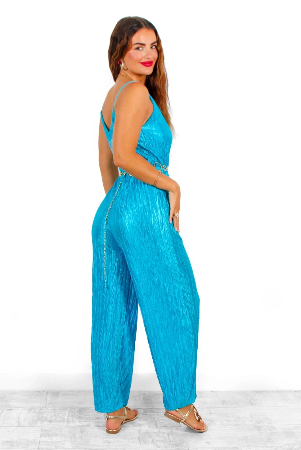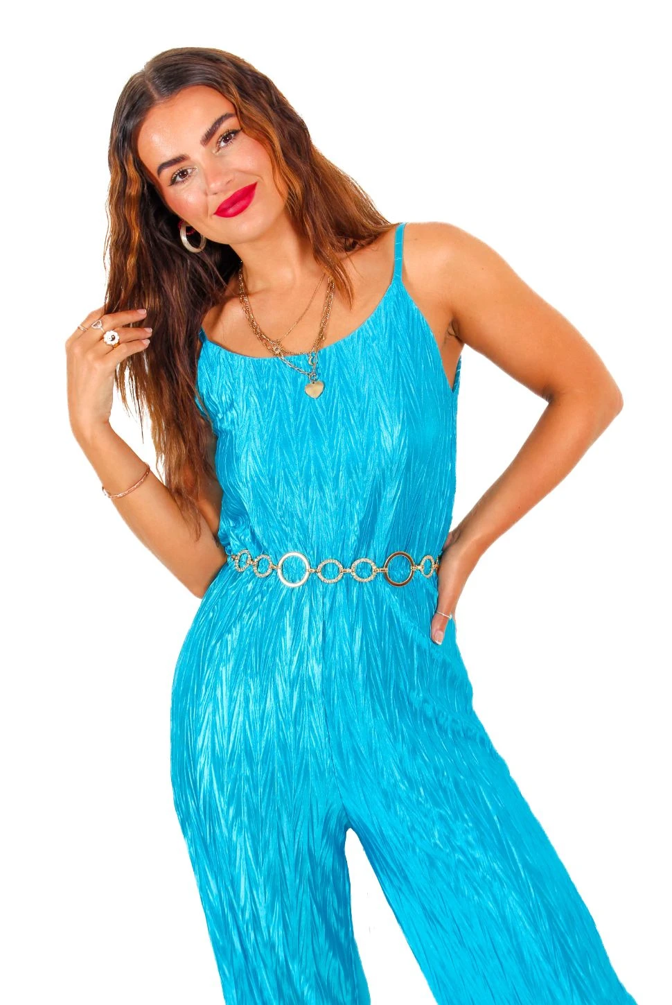 You’re sure to make ’em lose their breath in this sizzling teal blue jumpsuit! The on trend plisse detailing throughout and figure flattering cinching waist-tie will have you oozing confidence and take you from day to night in serious style. Plus, the wide-leg fit and adjustable straps guarantee a super comfortable fit – major attention on you, Doll. Ready to make heads turn? Prove that you can keep up when it comes to fashion and strut your stuff in colour contrasting fuchsia or zesty orange accessories.