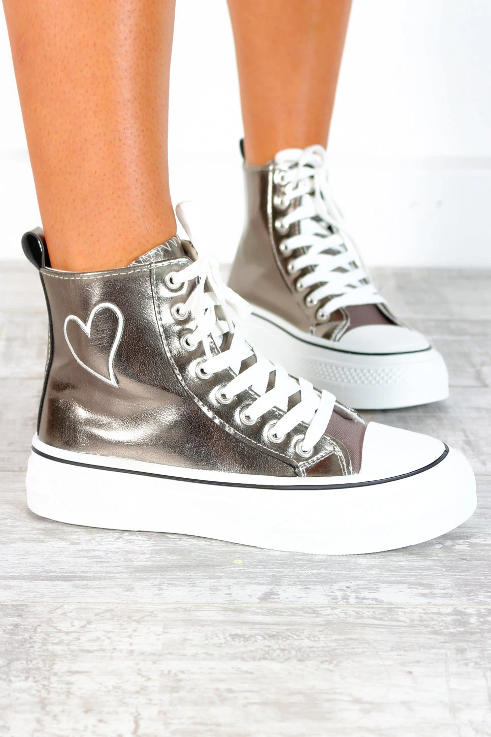 Don’t get caught out of step in the fashion game, Doll! Break hearts in style in this season’s must-have platform high top trainers. In an all-over metallic gunmetal grey canvas with pavement pounding chunky platform sole and all the little textured details we’re obsessing over, complete with adorable heart print embroidery. Style down smarter fits with this snazzy sneaker, or add these to your off-duty rotation for added fashion points.