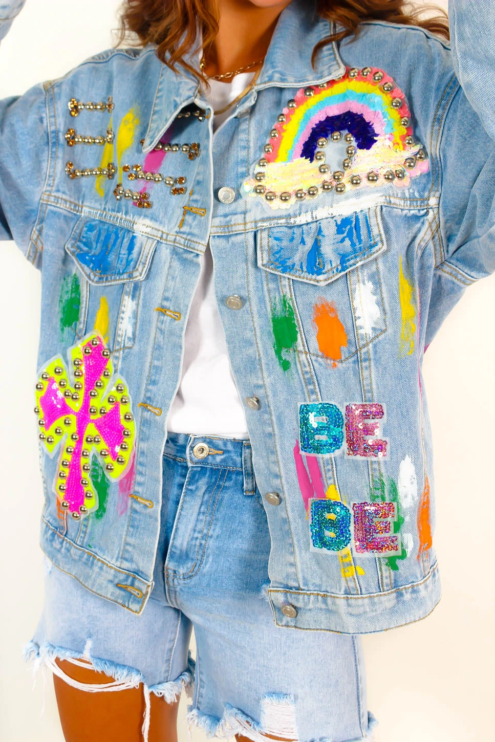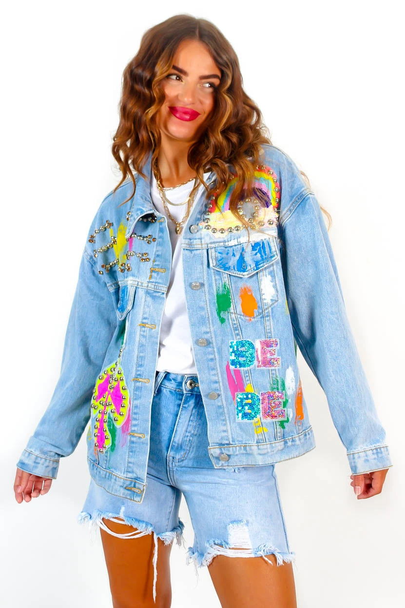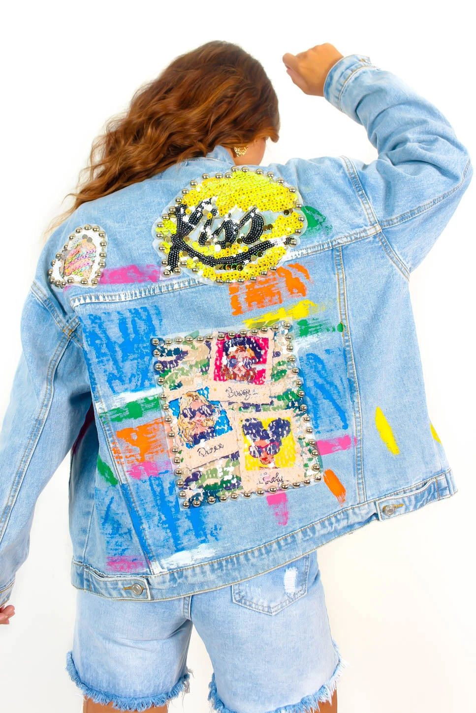 She’s the ultimate cool girl! Look insanely stylish is this light wash denim jacket. Embellished with vibrant sequins and studs and detailed with a paint brush effect, it’s perfect for when you need to make an impression – with maximum style and minimal effort! Throw on over any ‘fit for a head turning look wherever you go.