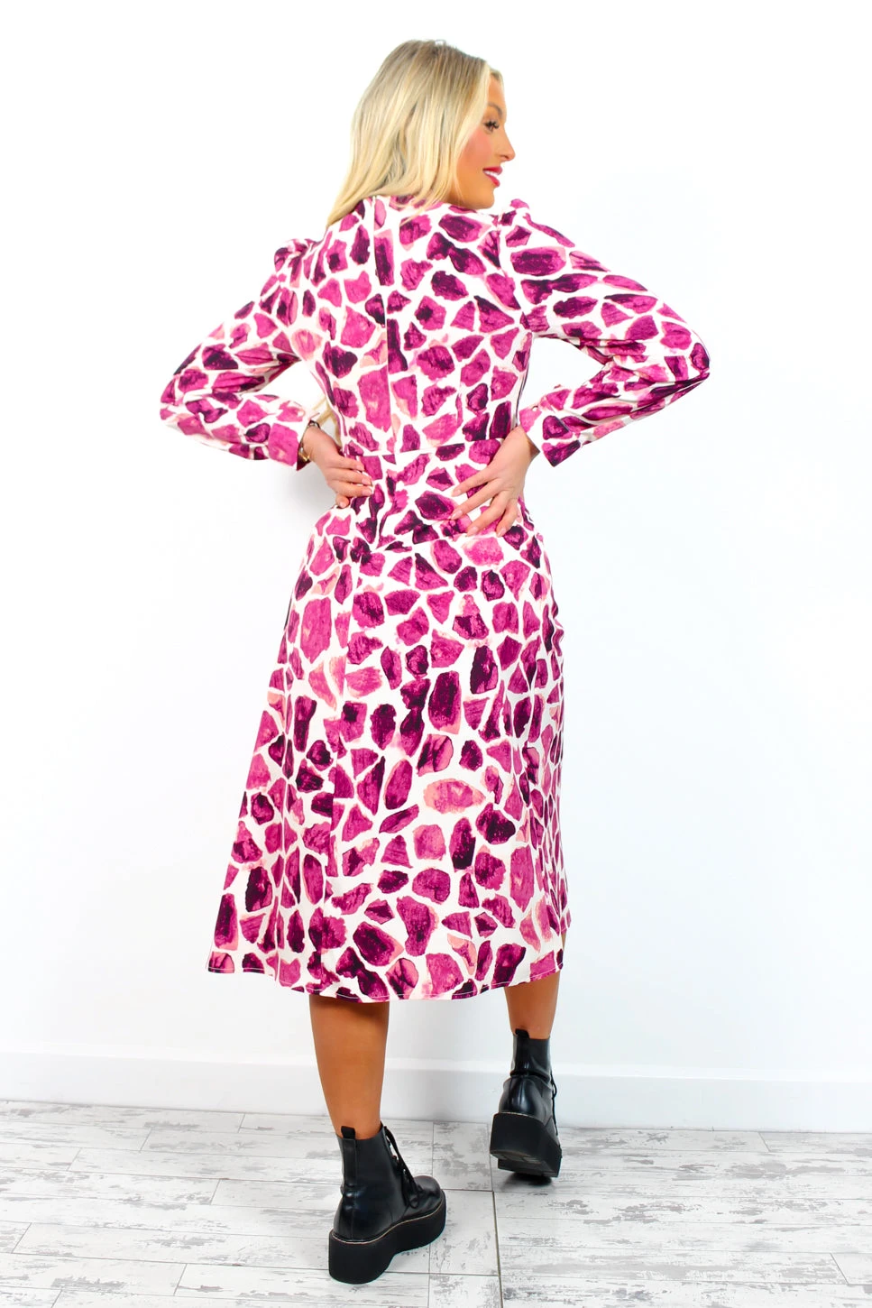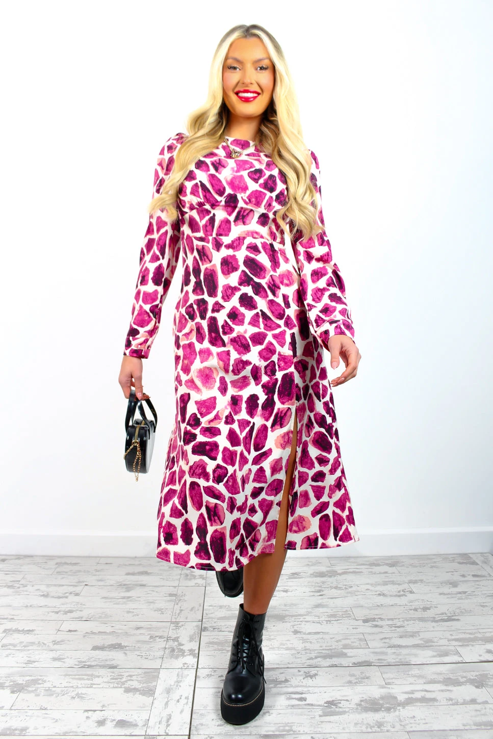 You’re too glam to give a damn, Doll. We’ll never be over magenta, it’s here to stay! Giraffe printed and complete with long cuffed sleeves and a daring double leg split to show just the right amount of leg, this midi is a super versatile day to night dress. Just add glimmering gold heels for wild nights out on the town or statement chunky black boots for a grungy daywear look.