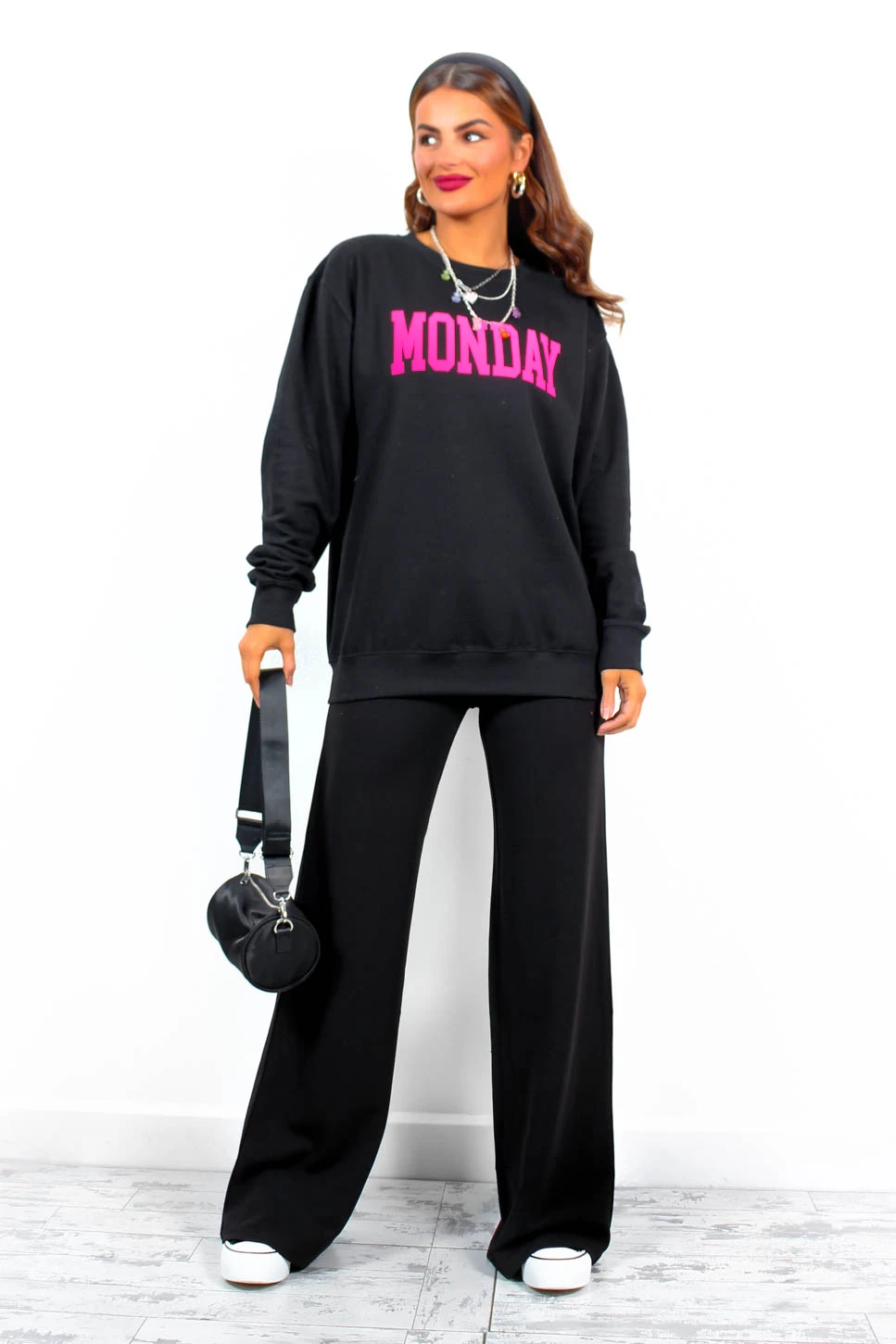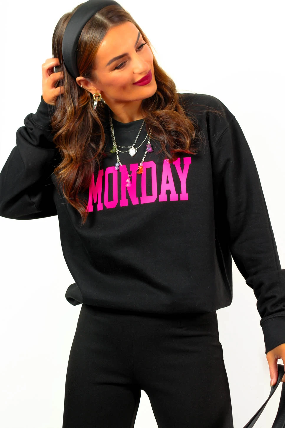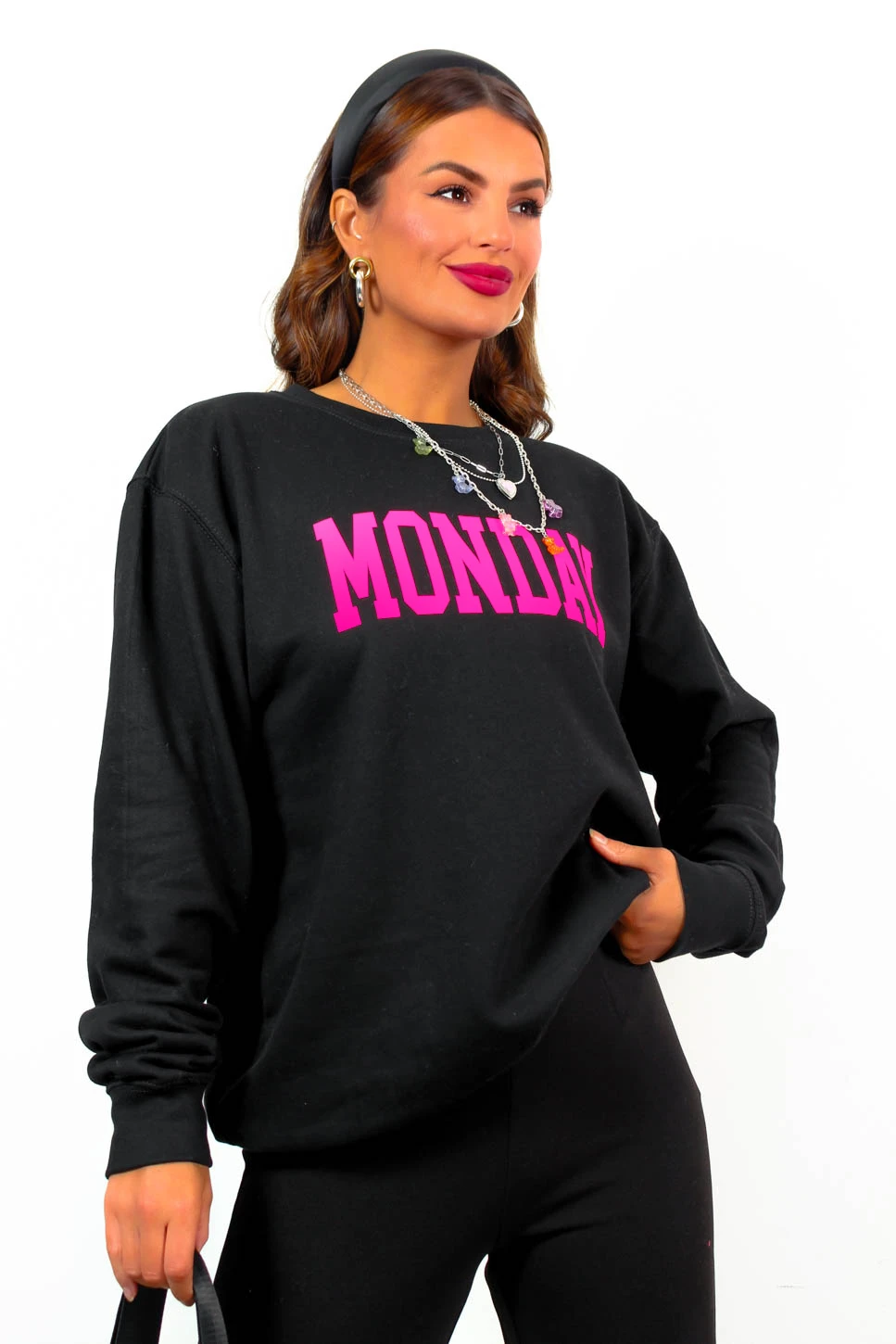 Monday blues? Not on our watch, Doll. We’re all about that Monday hot pink! Start your week with a bang in this soft and super stylish black logo sweatshirt with popping pink “Monday” typography print. Whether you’re after a comfy off-duty outfit or a cheery office ensemble, this stunning staple can make even the most manic Monday into a fashion-forward affair. Not a Monday gal? We’ve got