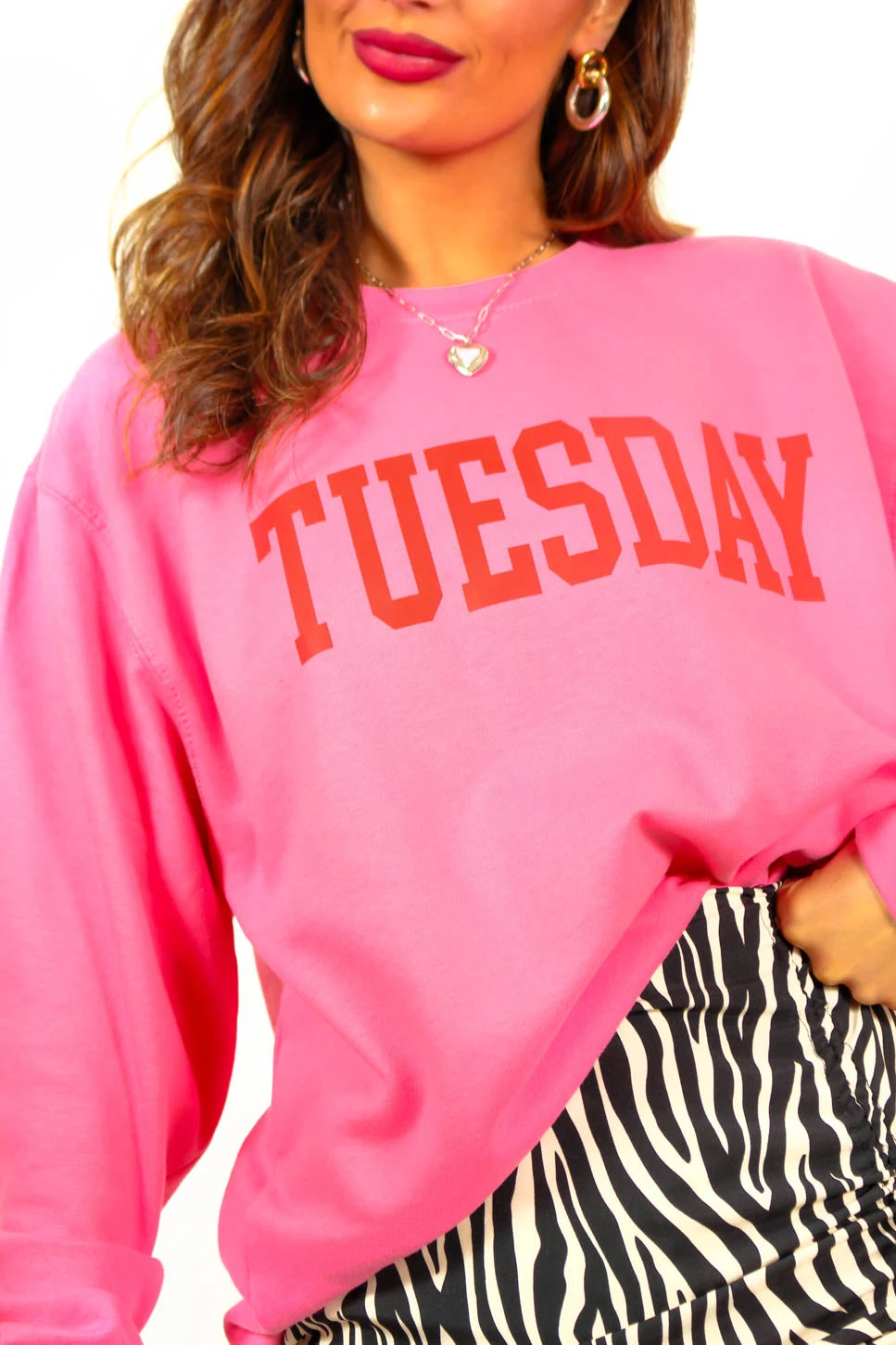 It’s Chooseday, Doll! Today we’re choosing this stunning slouchy sweatshirt to complete our casual chic fit. The perfect partner for your fav leather leggings, this punchy pink sweat with a rich red “Tuesday” slogan print almost makes us forget Friday’s so far away. Make the week fly by with a fabulous fit for every day – we’ve got