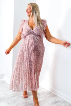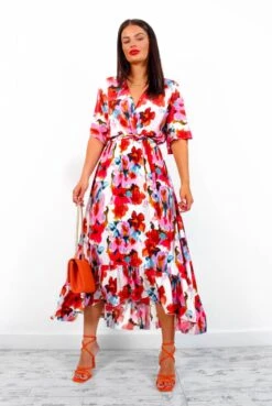 If it’s not florals, we don’t want it! In a midi length, this occasion wear stunner features a flattering bardot style top with straps, a wrap style skirt with a modest split, and complete with delicate blush florals on a black base. The perfect dress for that wedding you RSVP’d to, pair with matching blush pink accessories a classy look that is simply the epitome of elegance!