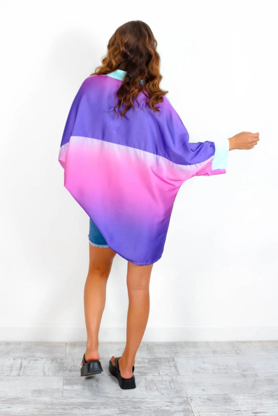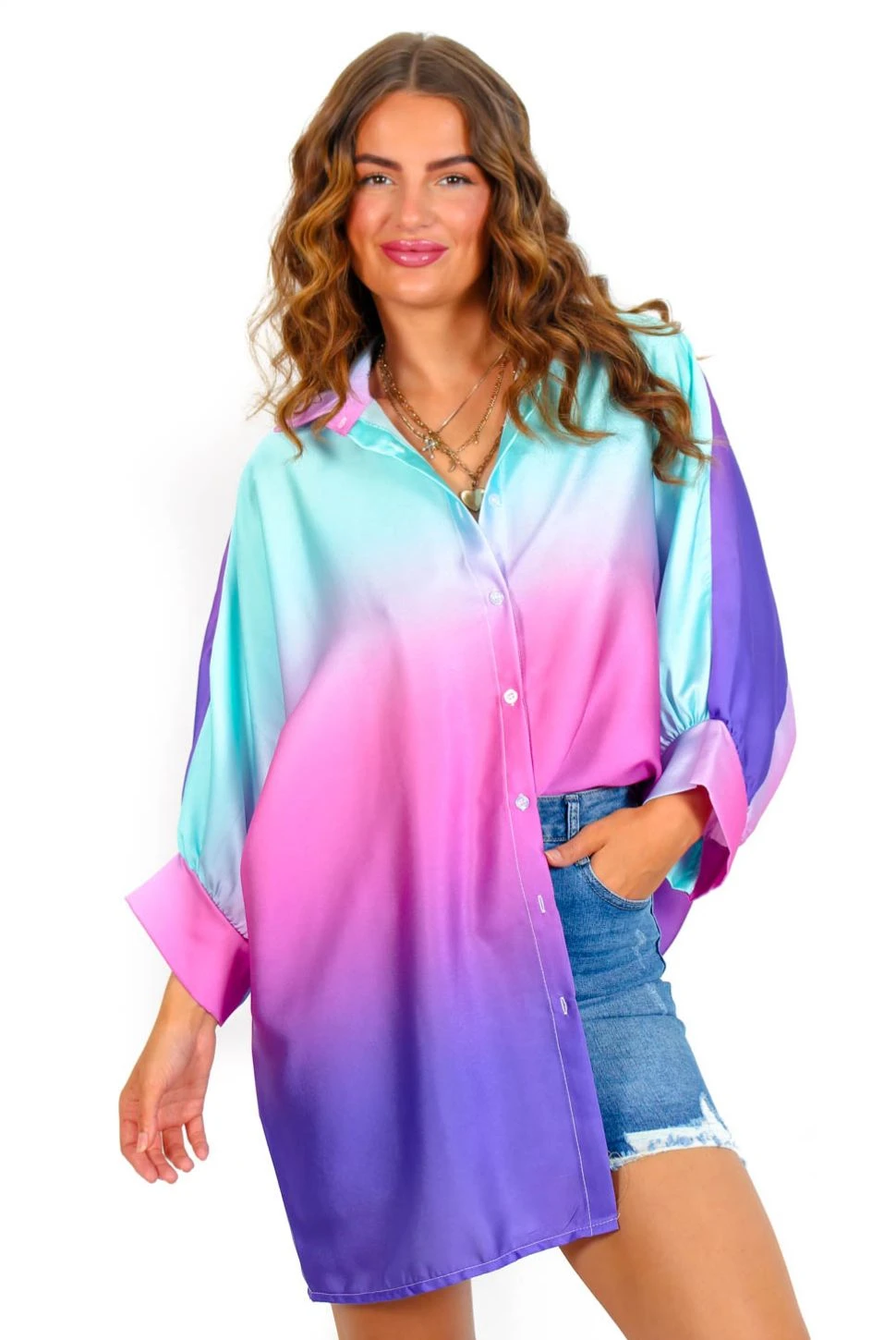Look like you just stepped out of a daydream in this ombre shirt. Giving us all of the ocean vibes in a dreamy lilac and blue ombre, this oversized shirt is perfect for sunny getaways poolside or stage-side at festivals. With a 3/4 cuffed sleeves, spread collar and button placket you can easily style open over your ‘fit or fully fastened to match the vibe. For off-duty plans just add a denim mini skirt, or slip it on over a bold bikini and let the warm days fade into you!