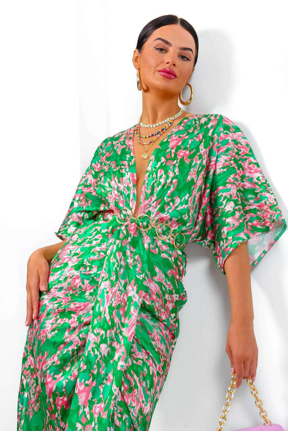 The dress you’ve been looking for… you’ve found it, Doll! With flowing batwing sleeves and a daring plunging crossover neckline, this green and pink abstract printed midi dress is sure to get those heads turning – it’s a satin dream! Complete with a subtle leg split and draping detail that totally flatters your figure. Look effortlessly glam on those holiday evenings at sunset drinks with a tousled up-do and your favourite sandals.