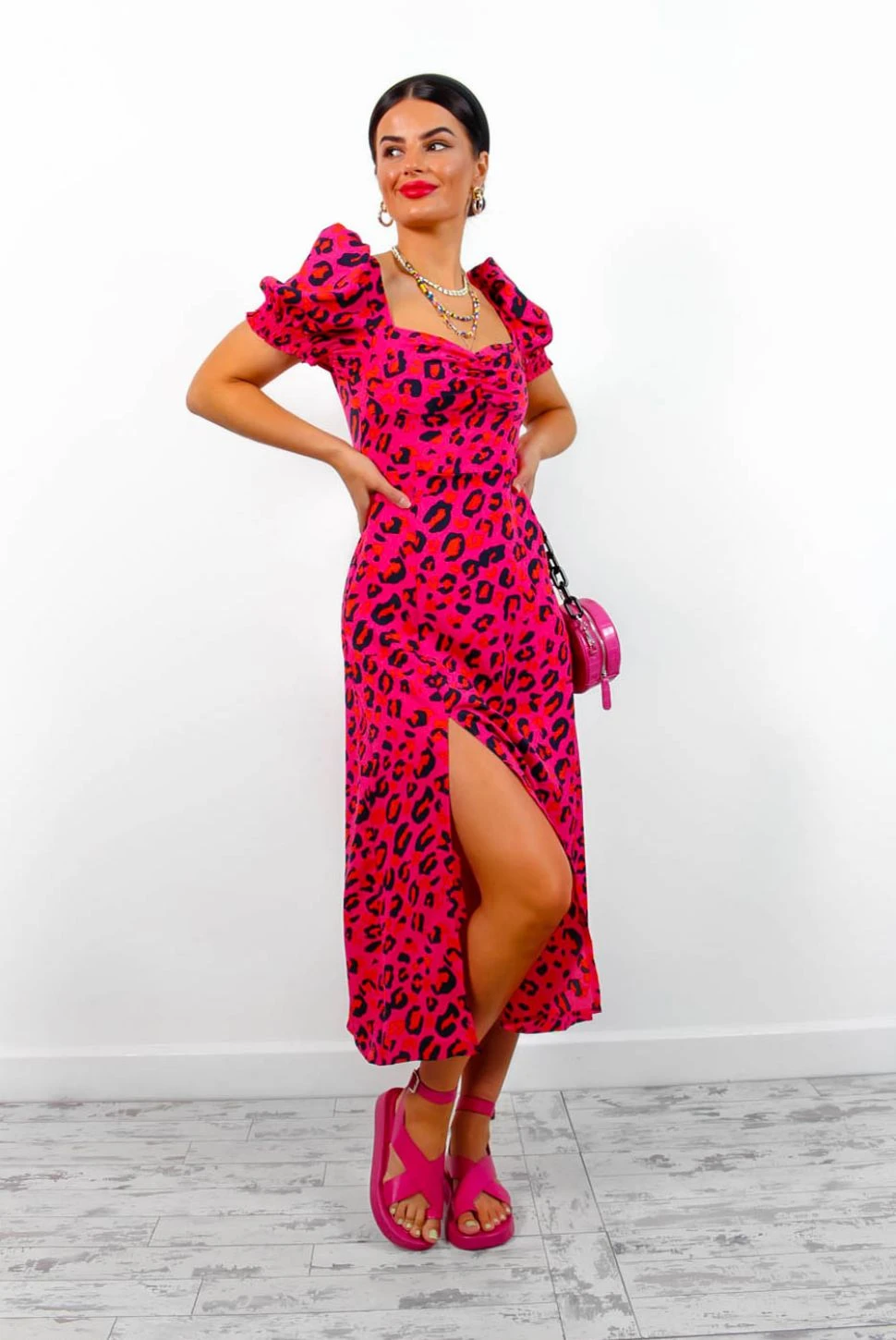 We’re in a total frenzy… over this dress! This midi dress features a fuchsia, orange and black leopard print throughout, short elasticated sleeves, a split leg, and a flattering sweetheart neckline. Pair with chunky sandals and matching clutch and you’re ready to pop the champagne at your picnic in the park. Purrrrrrfect!