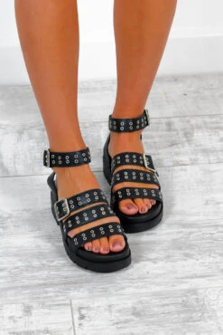 She’s Going Places – Black Silver Eyelet Sandals