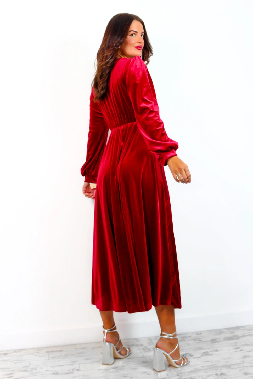Thinking of party season has us on cloud ‘wine’! This elegant midi wrap dress comes in a shimmering velvet fabric, a pleated design throughout the skirt, long sleeves, and a ring tie detail. Doll, you don’t need to look any further for that perfect party number, he stunning velvety wine colour have you looking luxurious all evening! Style with subtle gold accessories.