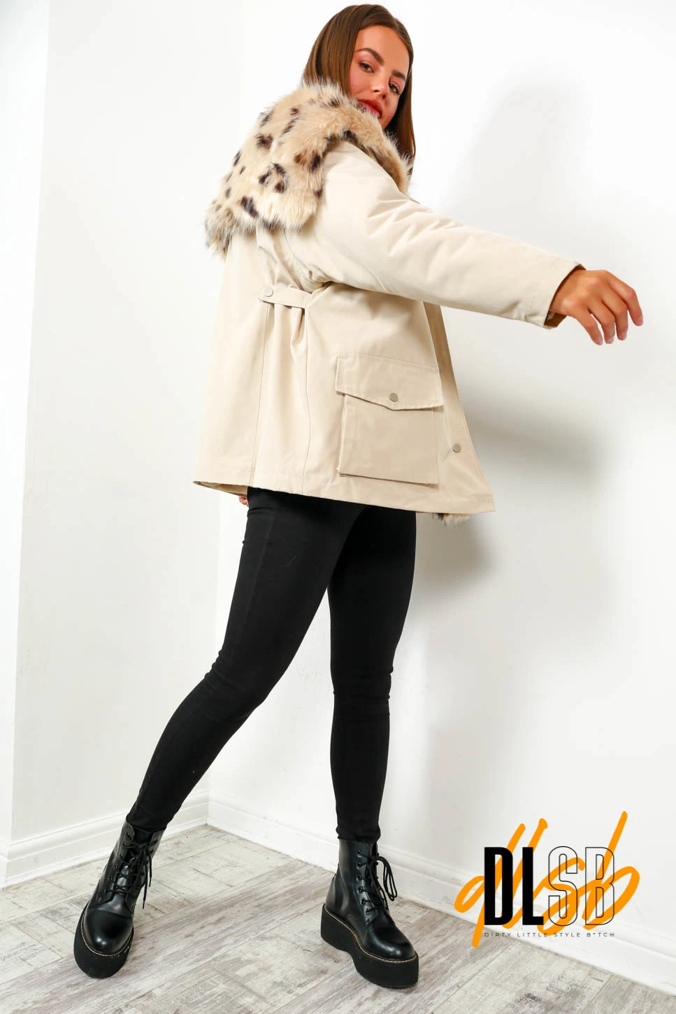 Tackle those cold and rainy days in this super chic jacket. This coat comes in cream waterproof fabric, beige spotted oversized fur collar and lining, popper closure, and side pockets. Style with an oversized roll neck jumper and leather trousers for a stylish look that’ll keep you cosy.