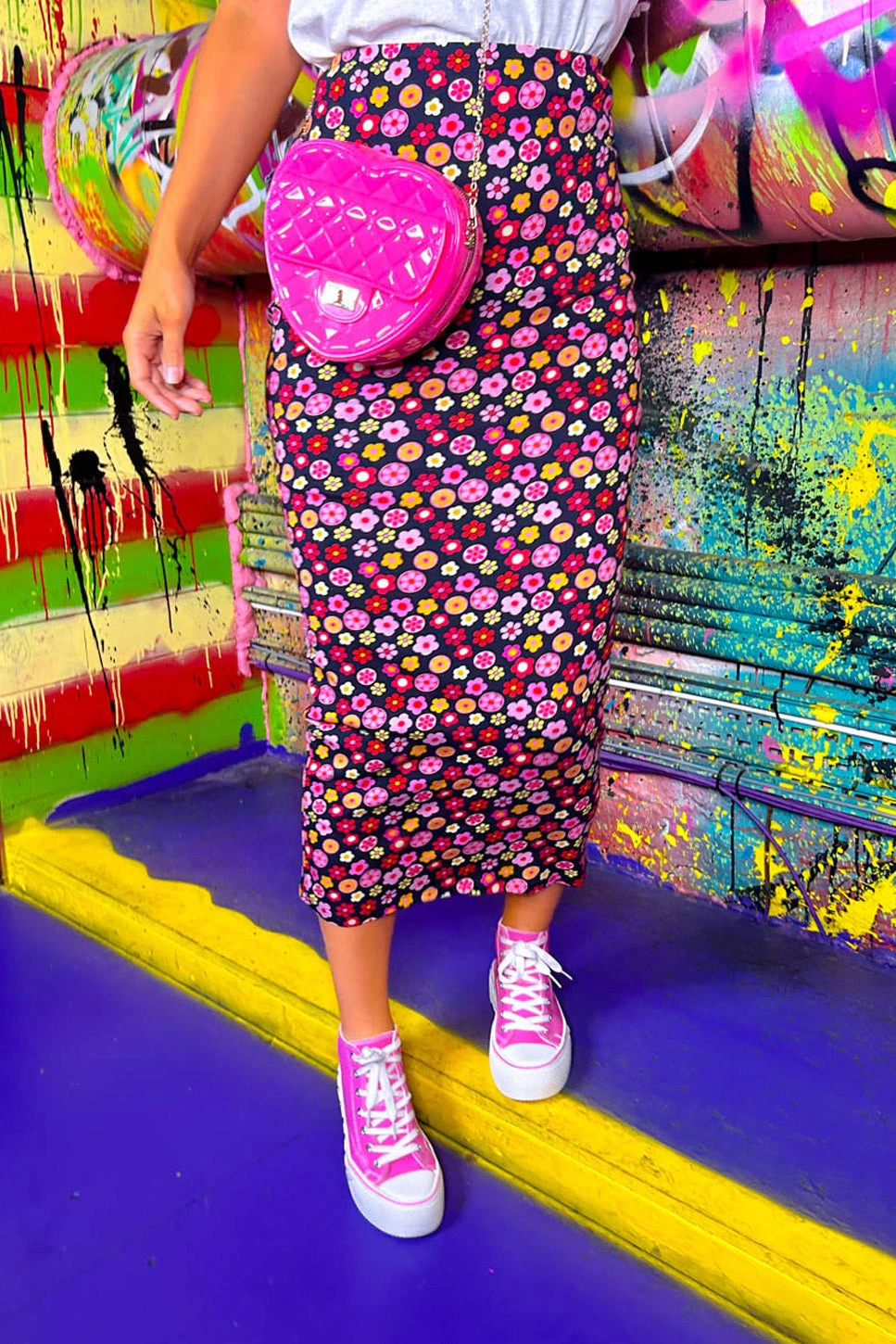 What is love? Baby don’t skirt me, no more. From the park to drinks, this midi skirt is super versatile and easy to wear. Made from soft cotton this high rise skirt hugs your curves with it’s bodycon fit and features a playful sticker type floral print throughout. Keep it casual in a white tee and chunky trainers or take it to drinks in punchy pink heels and a lacy bodysuit.