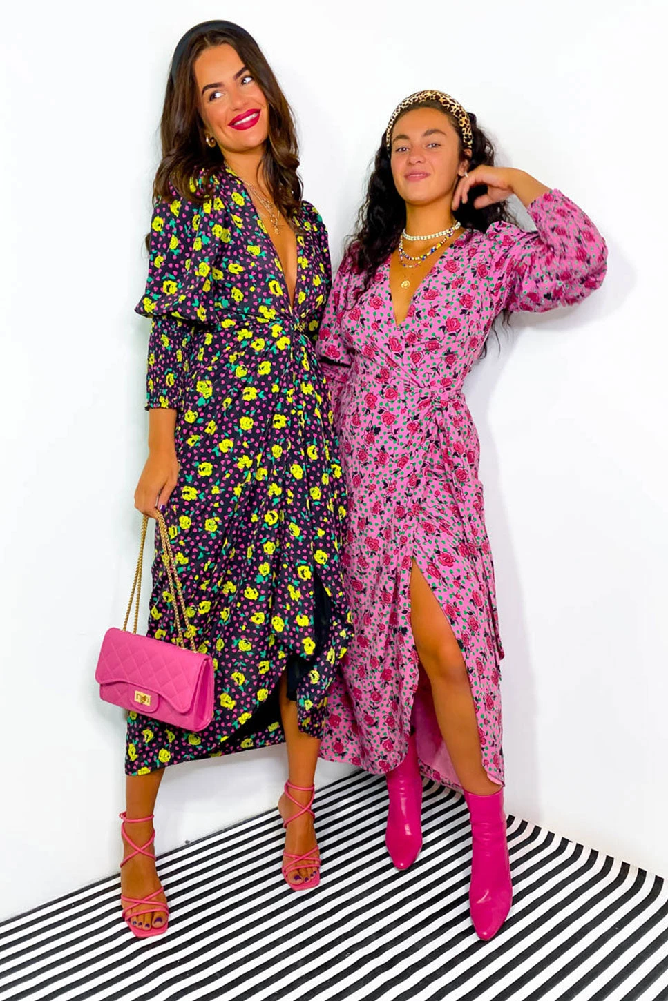 A true love story never ends just like our love for this dress. Earn all of the glam styling points in this romantic midi wrap dress. Top to bottom in yellow roses and utterly adorable mini pink hearts, we can’t stay away! Wear plunged with all pink accessories for those dreamy date night vibes.