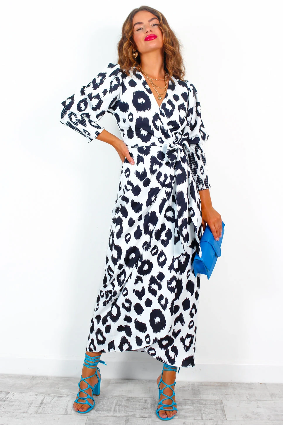 This dress drives our customers wild and we’re here with another gorgeous print this season. In a super fashionable white and black leopard print it can be styled in various ways with a more daring plunge neckline or a more modest, but still glamourous, side wrap-style. This stunning lined dress also includes a flowing hem, shirred sleeves and a whole lot of character. Style with black accessories and look a 10 all night.