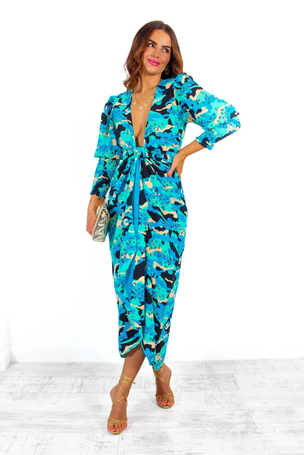 Currently crushing on camo! Don’t blend in, Doll, stand out in this bold blue camouflage print midi wrap dress. A true fan fave with dramatic 3/4 length shirred sleeves, super versatile wrap waist and all-over camo style animal print in tonal turquoise and blue, it’s driving us wild! Keep it chic with strappy black heels, or go all-out with teal accessories to turn heads.