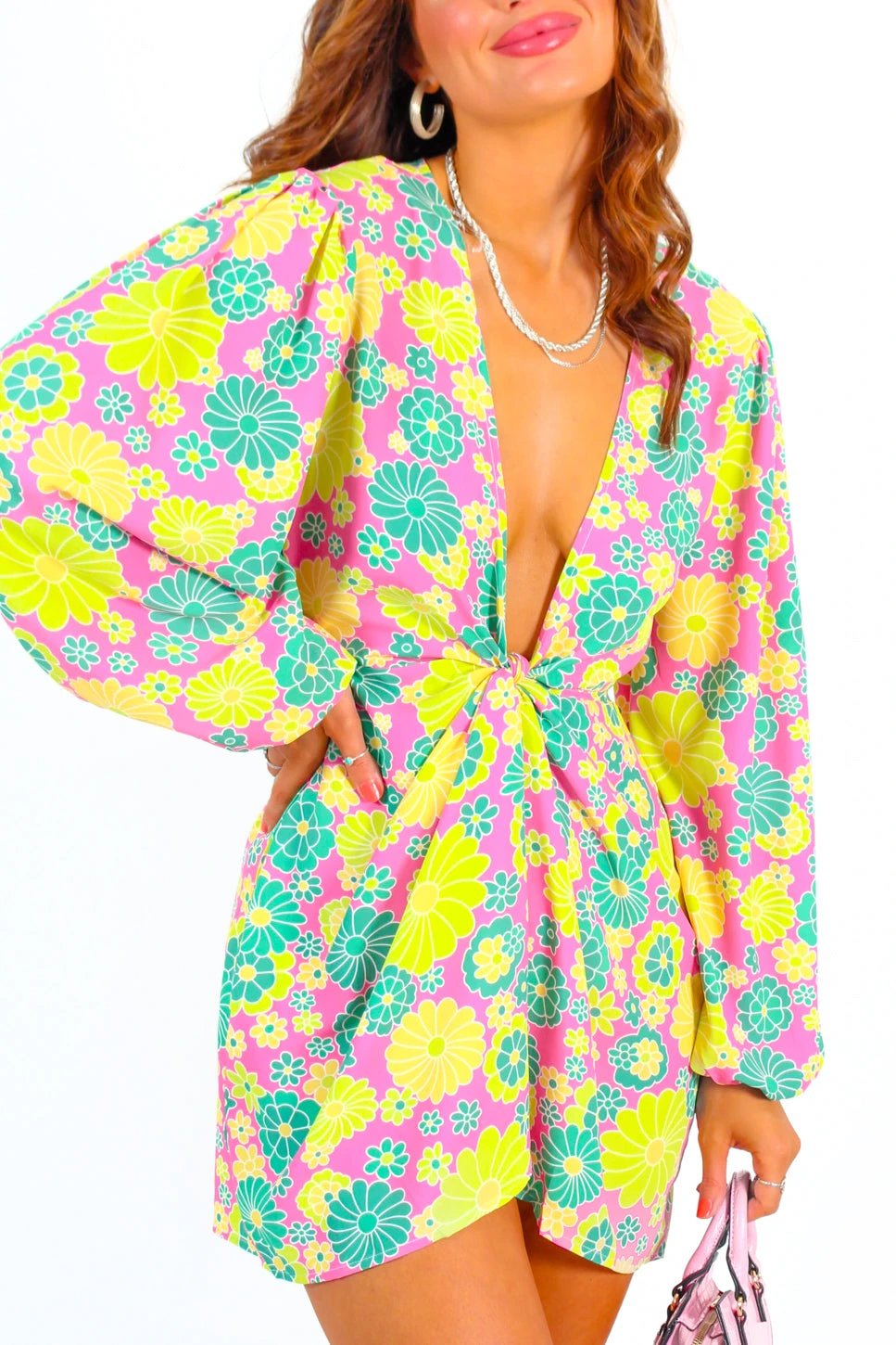 The season of flower power is back in full swing, Doll! Feel the floral fantasy in this blooming gorgeous flower print mini wrap dress. Blossoming with bold pink and green florals, this sweet and super stylish silhouette is topped off with a versatile wrap front fastening, floaty mini hemline and loose cuffed sleeves. Go with the flow in matching pretty pink heels or start a revolution with chunky biker boots and a zesty lime clutch!