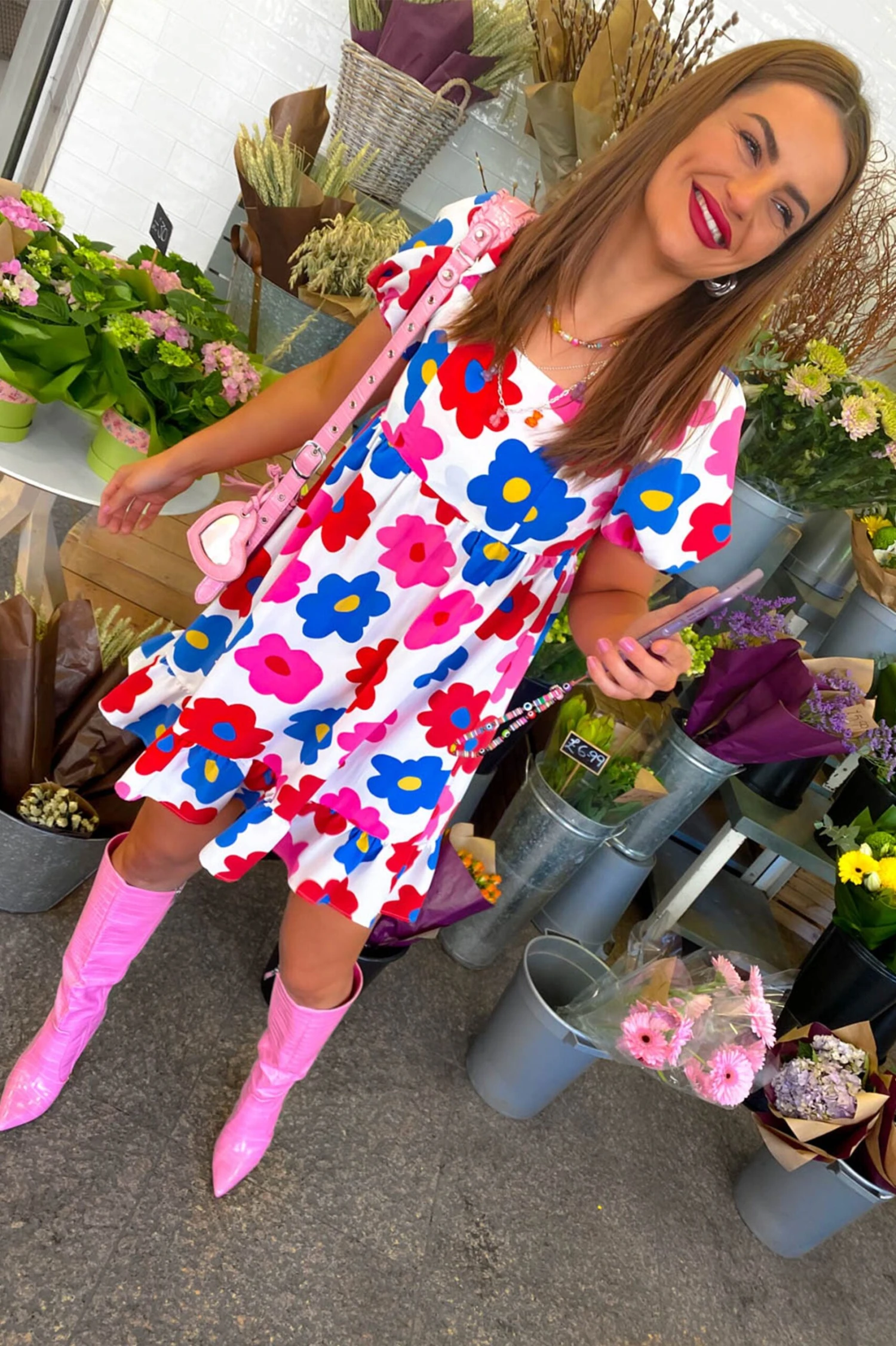 The 70’s called and they love your outfit. In the print of dreams, this super cutesy mini dress features a large floral pattern in pink, red, blue, and yellow. Featuring a square neckline, puffed elasticated sleeves, a floaty tiered hemline, and an elasticated back, this dress is fun, flattering and funky! Stick to the retro era and style with white heeled ankle boots and a bright bag, don’t forget those shaped sunnies to finish off the look.