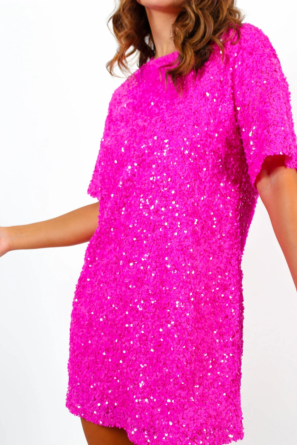 Glow get it, girl! Own the spotlight at any event this festival season in this vibrant and dazzling sequin mini dress. In a punchy pink, this sequin t shirt dress is shimmers with stunning sequin embellishment throughout creating a radiating glow as you shimmy through the crowd. Pair with chunky boots and a fringe bag for a festival ready look ideal for any fashionista.