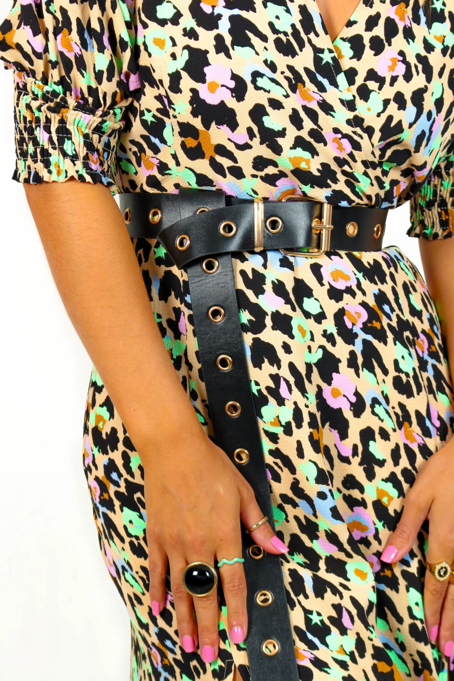 Secure your style with this bang-on-trend black and gold belt. Featuring a black faux leather belt with gold square buckle and eyelets, it’s perfect for amping up your casual or going out looks. Style it around the waist over a simple t-shirt dress with chunky black boots and a red lip to rock that effortless chic look.