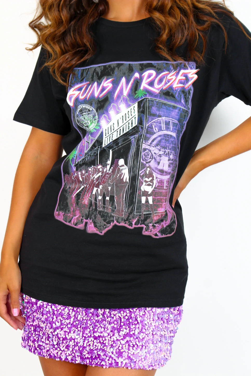 Welcome to the jungle, Doll! Serve those not-so-sweet child o’ mine vibes in this amped up Guns N Roses graphic band tee. Featuring a classic crew neck t-shirt fit in a black with a grungy deep purple Guns N Roses graphic print. Take it on tour tucked into a purple metallic mini skirt with killer heels for a night on the with the girls or chunky boots for head turning festival vibes.Â