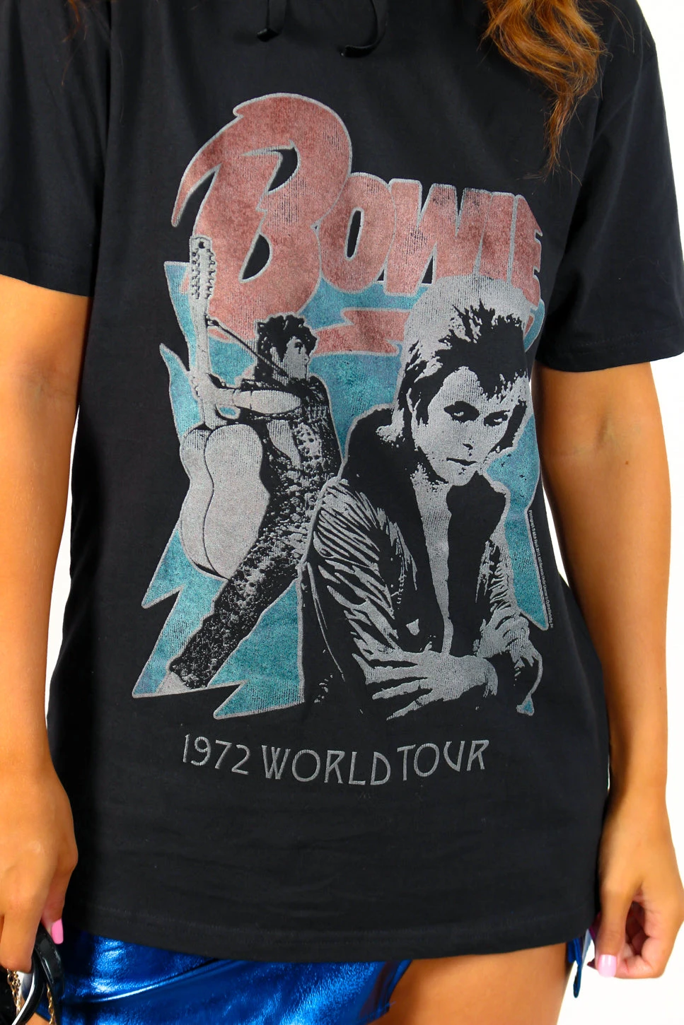 Is there life on Mars, Doll? ‘Cause you’re looking out of this world in this bold David Bowie graphic band t-shirt! A classic crew neck tee fit in grungy black with a distressed David Bowie 1972 world tour graphic print, it’s top of the tops for those pub nights and mates dates. Style it super oversized as a fabulous t-shirt dress, or tuck into flowing wide leg pants with platform boots for showstopping Stargirl style. Let’s dance!