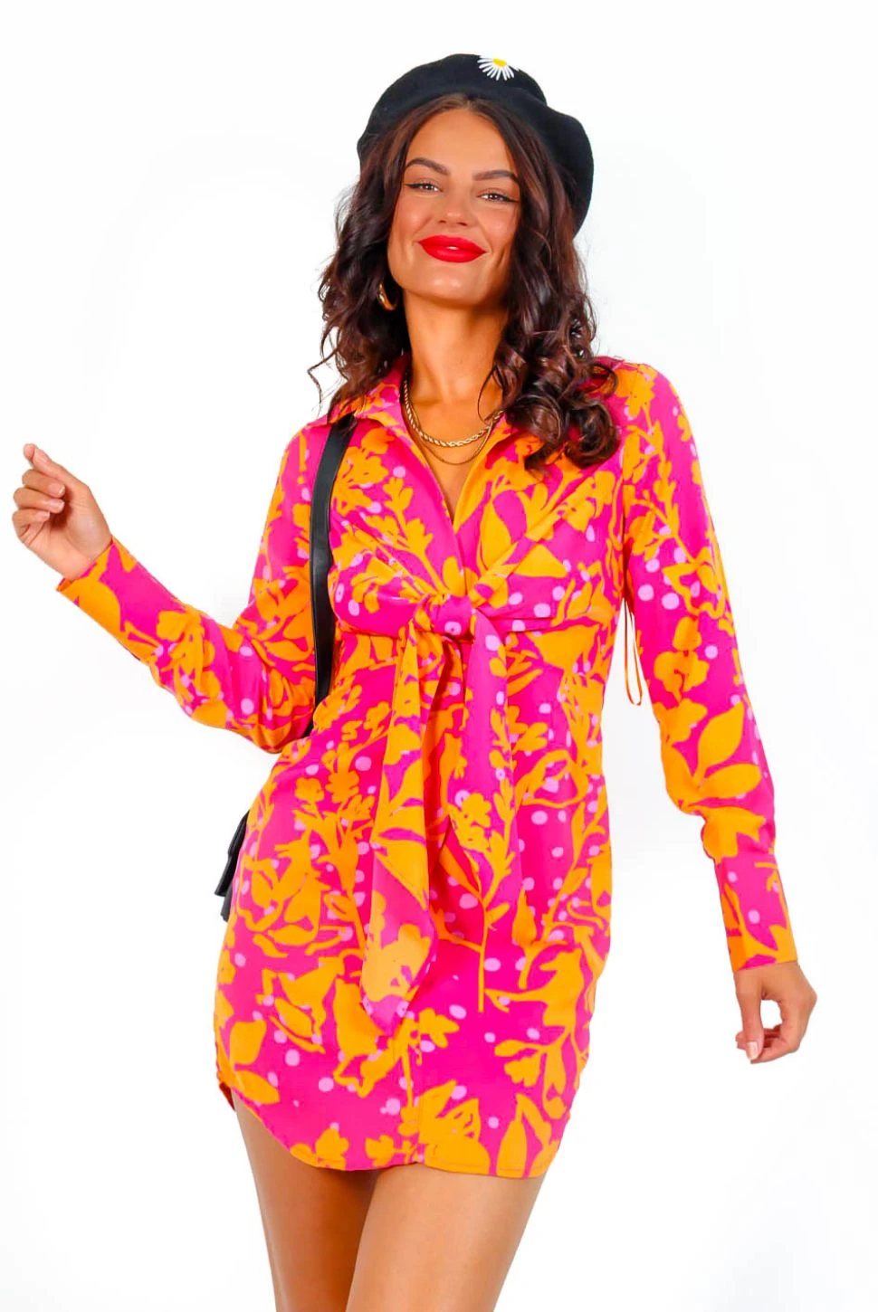 It’s infatuation! In our favourite colours, this mini comes in a tropical pink and orange floral print, long cuffed sleeves and a collared neckline plunging into knot detail tie. It’s a must to pair this with fuchsia accessories and leave the whole of the bar infatuated with you!