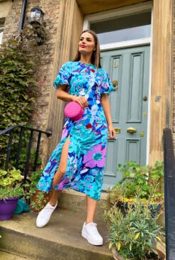Amp up your weekend wardrobe with this teal multi-coloured printed dress. In a midi length, it has a split leg and flattering short floaty sleeves. Style with trainers for a low-key look or dress it up in heels.