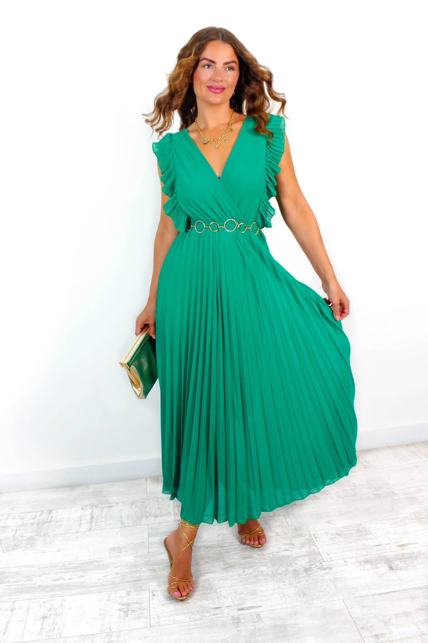 Keep ’em keen in green! My, my how can we resist this maxi dress!? Featuring a solid green throughout, waist-cinching elasticated fit and short frilled sleeves with a flowing pleated skirt. This bright and bold beauty is fully reversible and looks stunning both ways, giving you double the outfit opportunities! Dress it down with a grungy belt and chunky boots for a vibrant festival look we are loving this season.