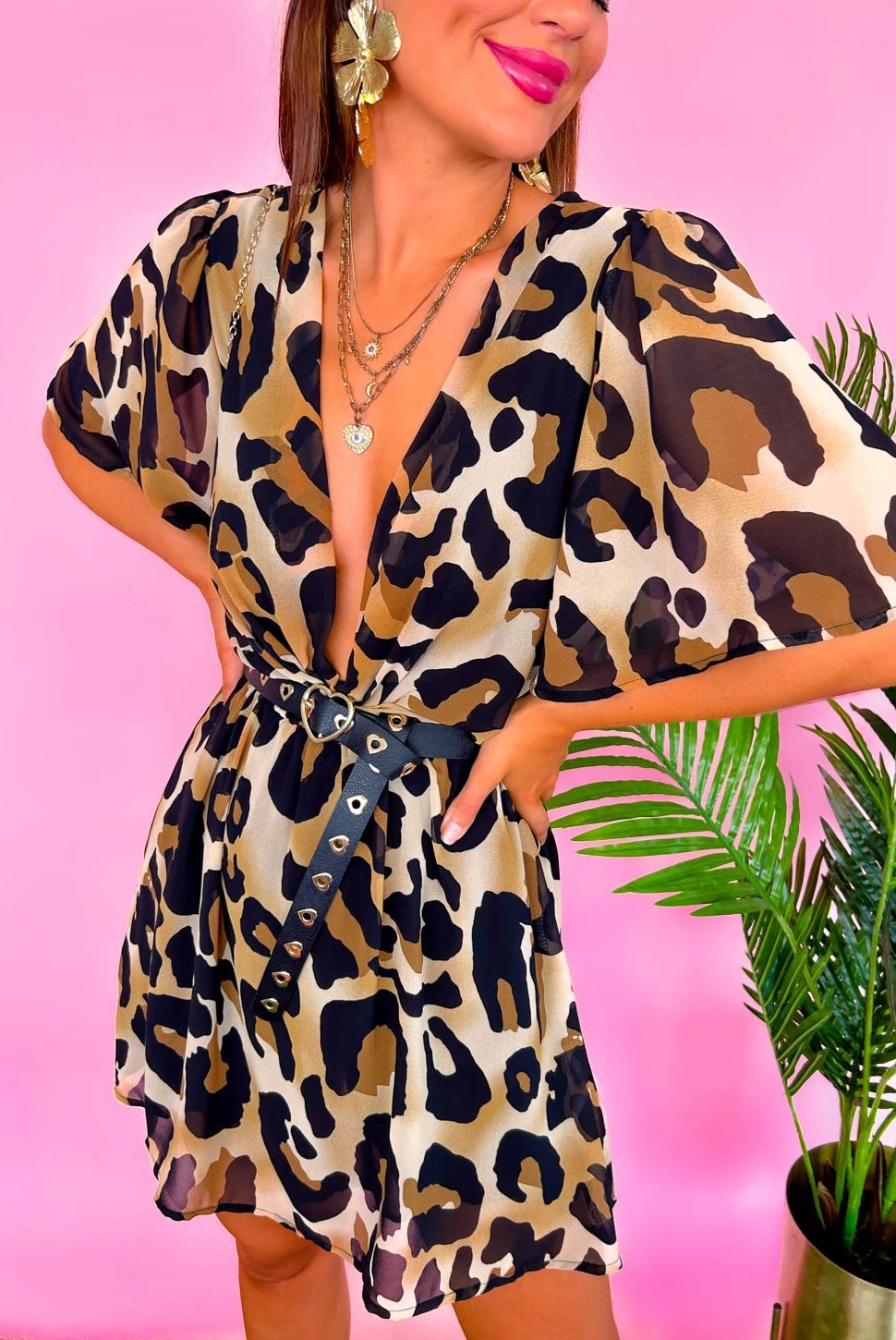 Us and this dress? It was love at first sight! Fall head over heels for this swoon-worthy mini dress. In all-over fierce leopard print, it features floaty short bell sleeves and a matching printed buckle belt with belt loops. Now that’s amore, Doll! Spice things by plunging the V-neckline and adding neon heels, or keep it cool on scorching days in sunnies and chunky sandals.
