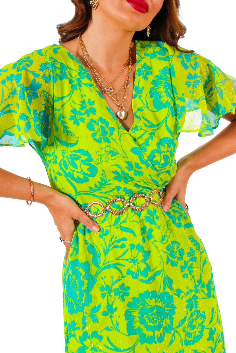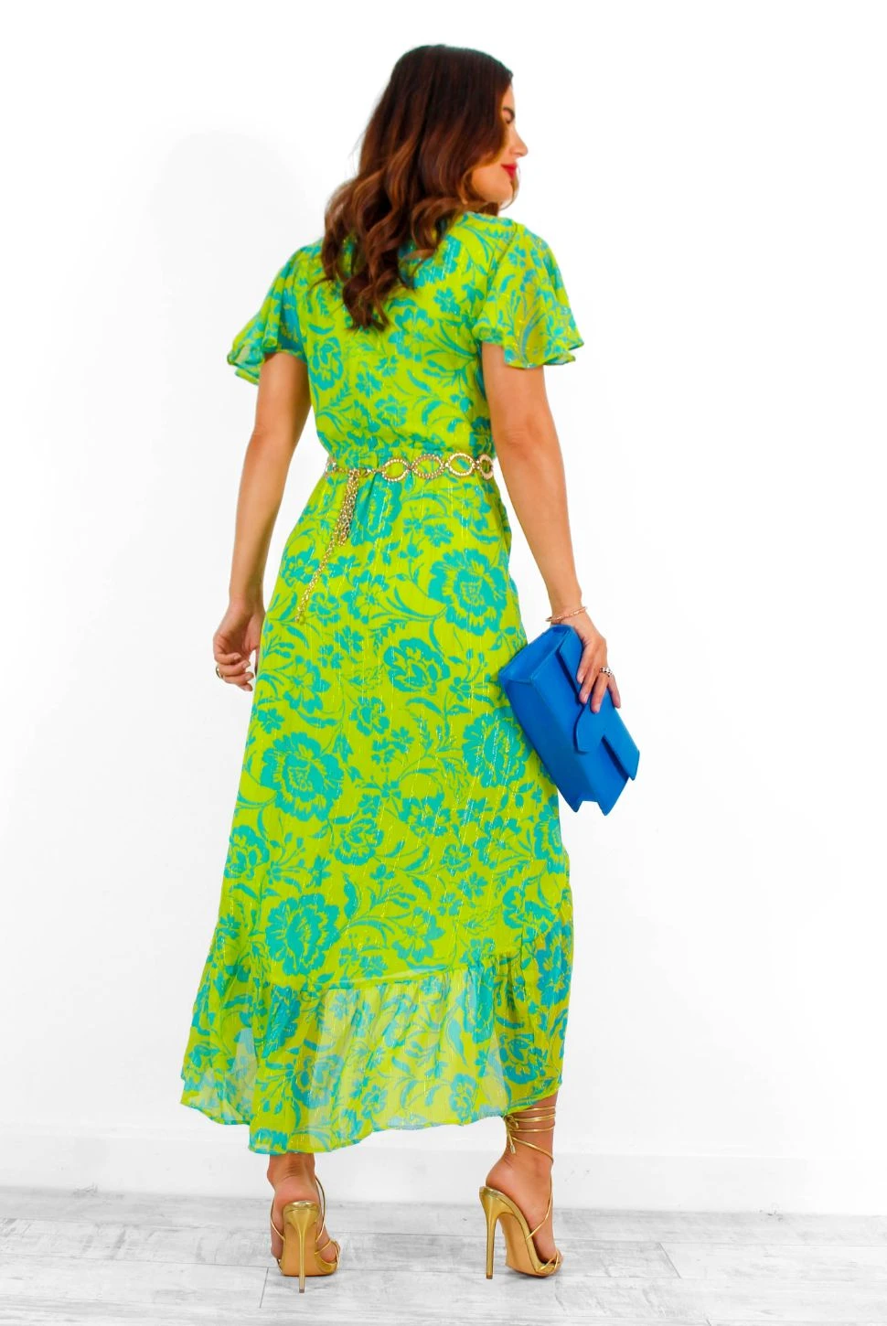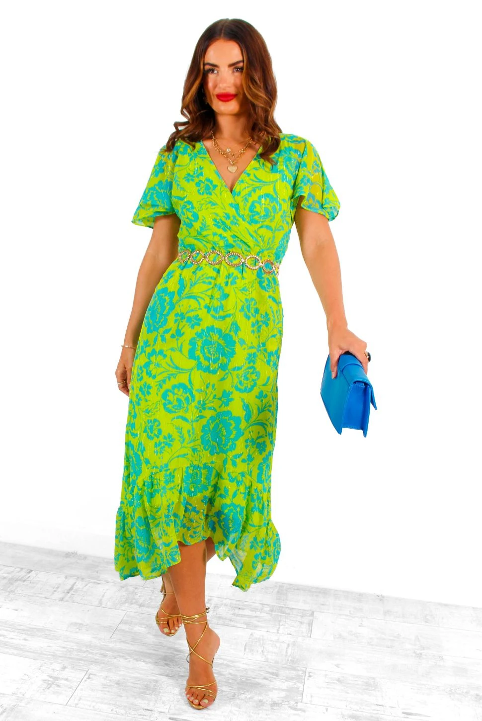 Hey bi*ch, ya missed me? With glimmering lurex threads throughout, this midi dress is blooming in zesty green and teal blue florals – and we are utterly obsessed. It’s all eyes on you as you glide to the open bar, the floaty hemline and frilled sleeves flowing as you go. They’ll not miss you as you walk into the room in this zesty number! Look super chic at those wedding soirees with dainty gold jewellery and a glass of champers. Cheers, Doll!