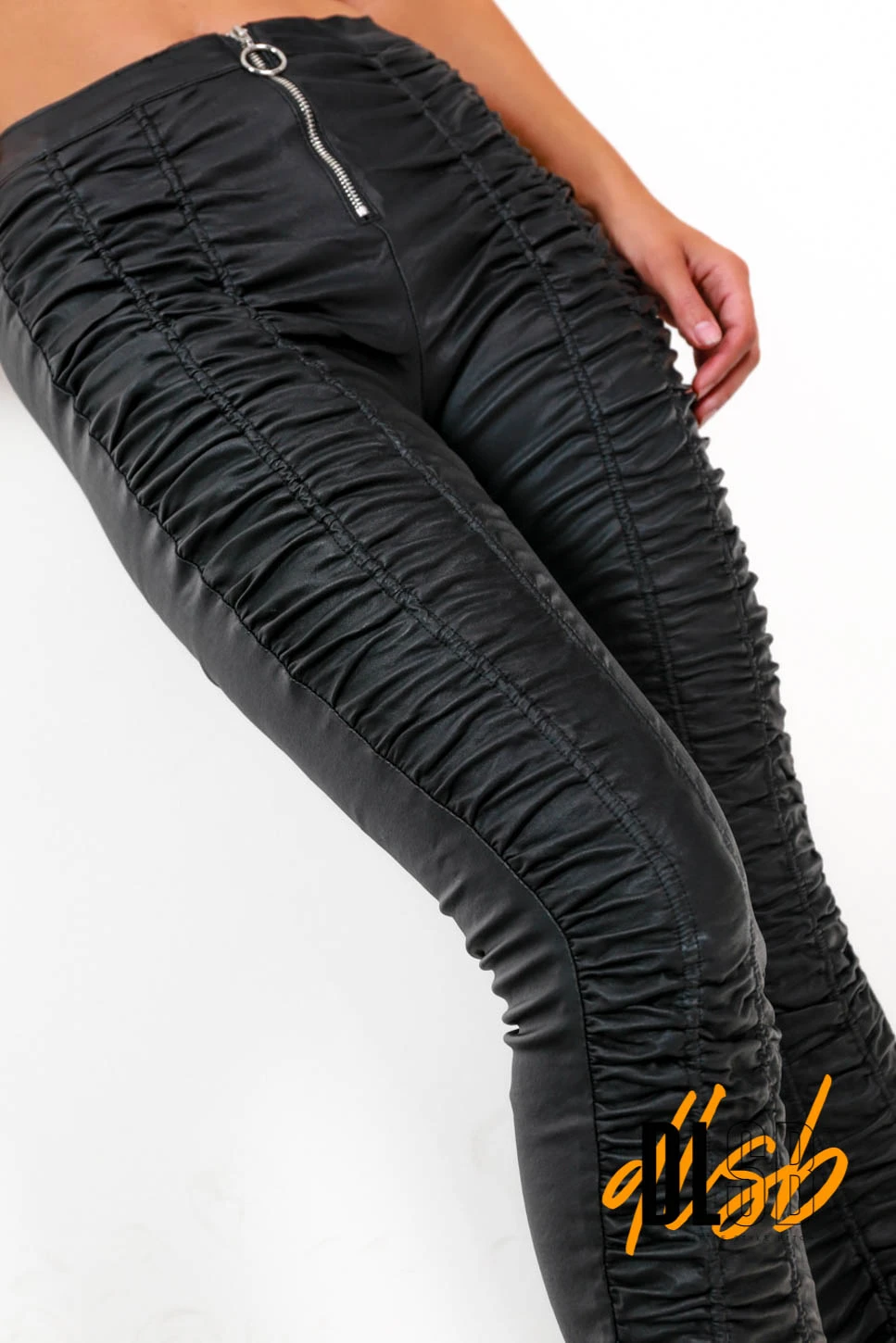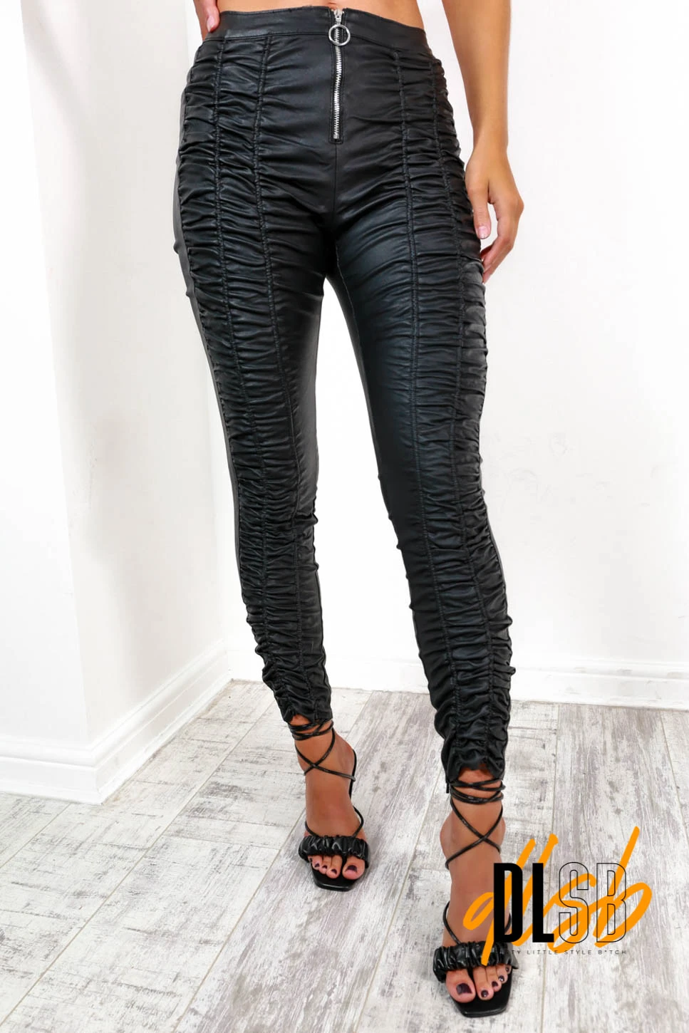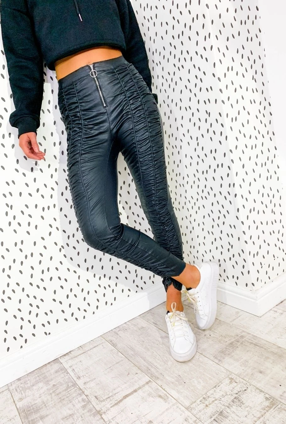 Your basic black trouser but with a twist, these bold bottoms come in a faux leather material, ruched detail throughout and a ring zipped in the front. Team with a cropped graphic tee and trainers for an edgy day outfit.