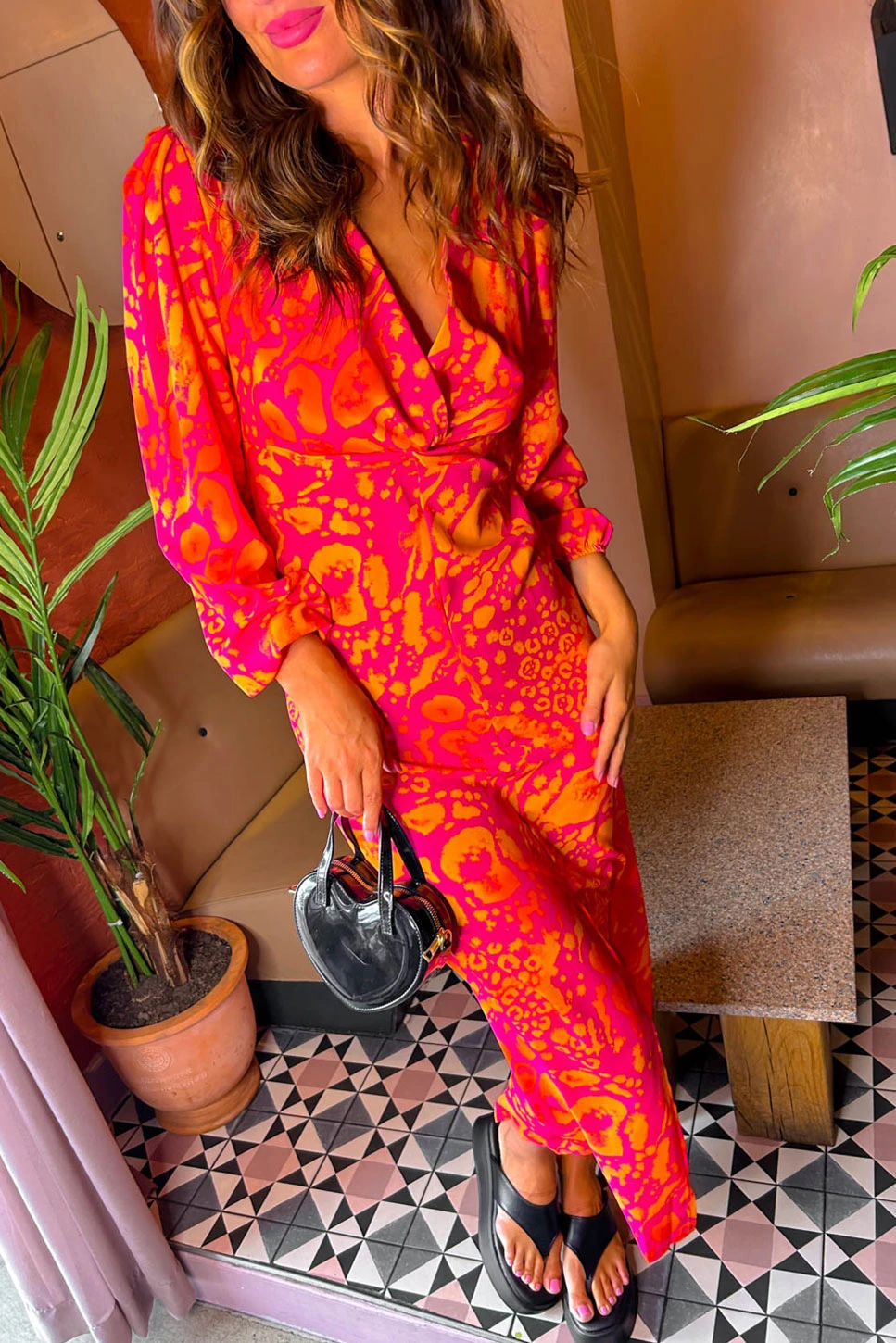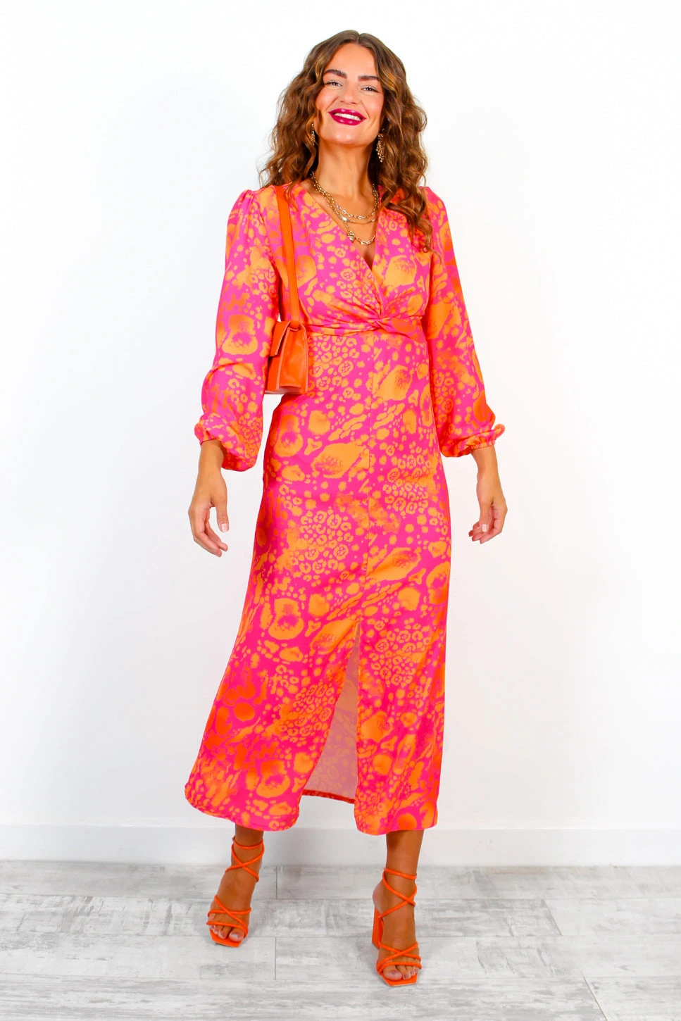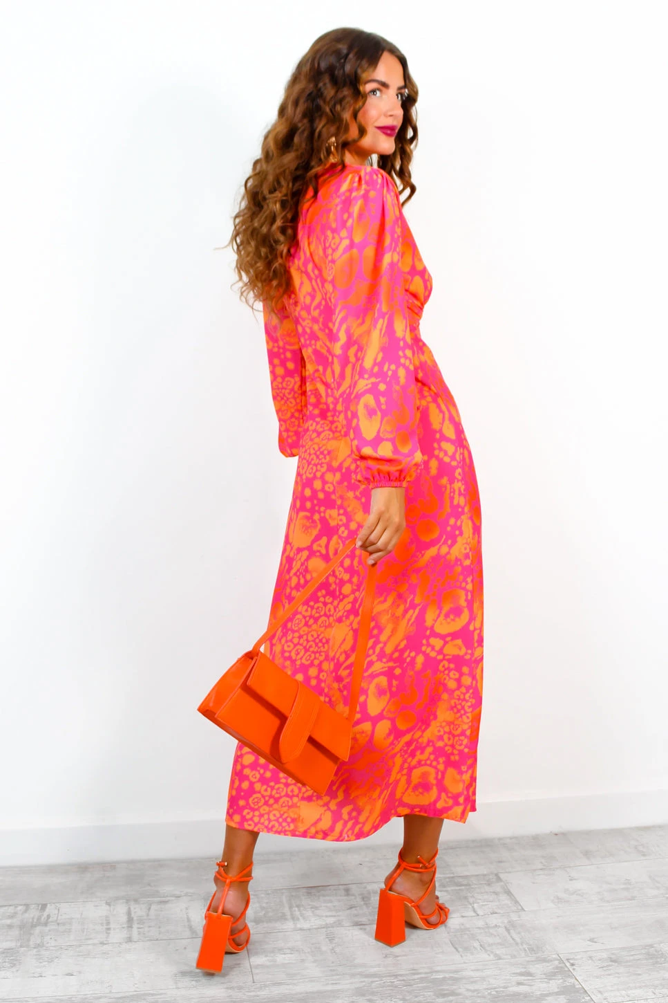 No regrets, only fabulous fashion choices! Embrace your inner fashionista and make a fearless statement with this midi dress that exudes confidence and style. With a sassy front split the abstract print and vibrant colourway adds a burst of personality while the twist front detail cinches the waist creating a flattering fit. Strut your stuff in zesty orange accessories to leave a colour popping impression at any event your attending.