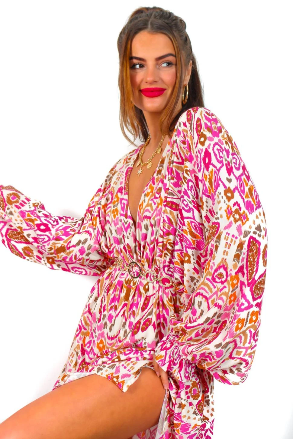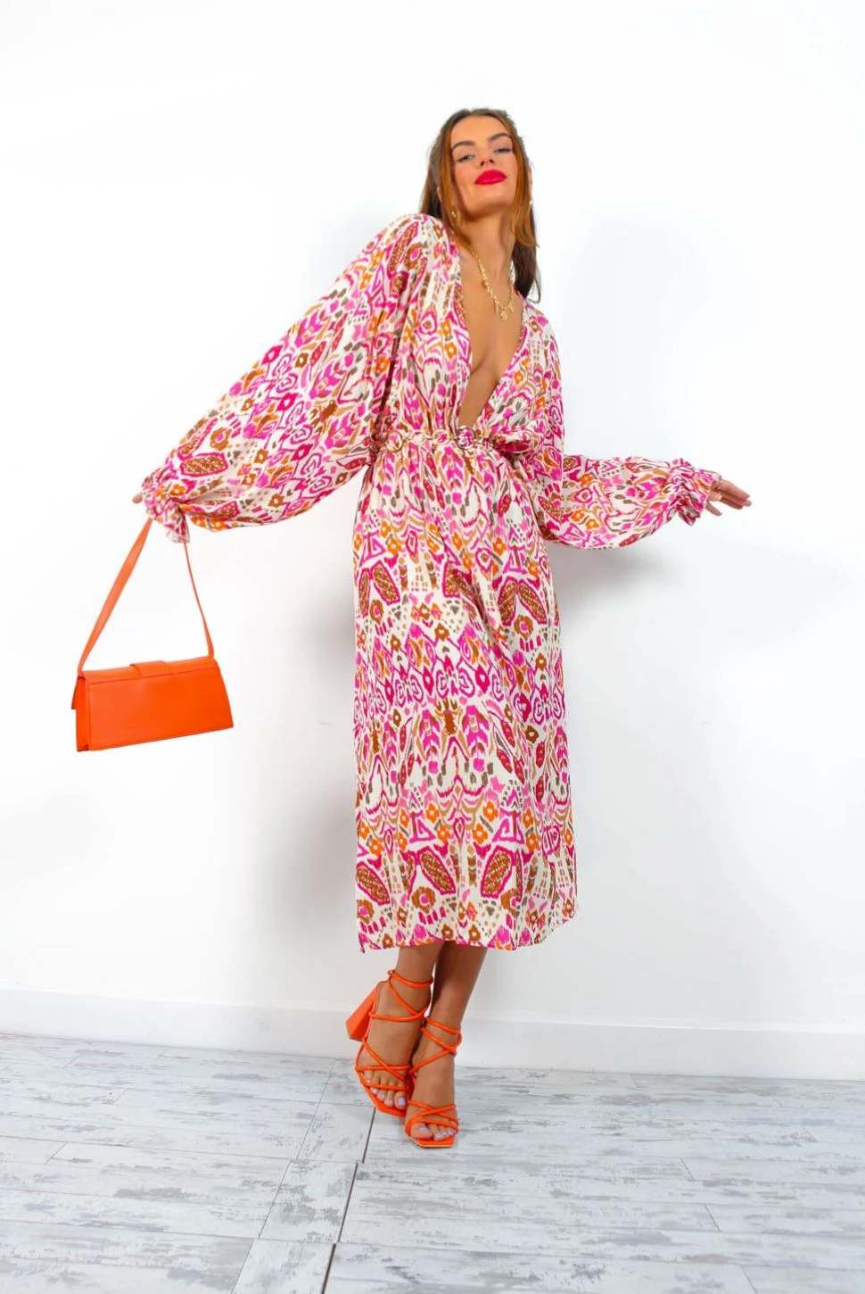 This dress isn’t just a vibe, Doll, it’s a whole mood! They’ll all wanna be feeling bohemian like you in this flirty and forever-flattering long sleeve boho midi dress. Layered with a stunning orange, brown and magenta tribal print in the perfect transitional tones, this dreamy midi dress with batwing sleeves and wrap-look waist is our current Spring fling. Style with a neutral western boot for prairie girl vibes or sling on strappy heels to spice up nights out-out!