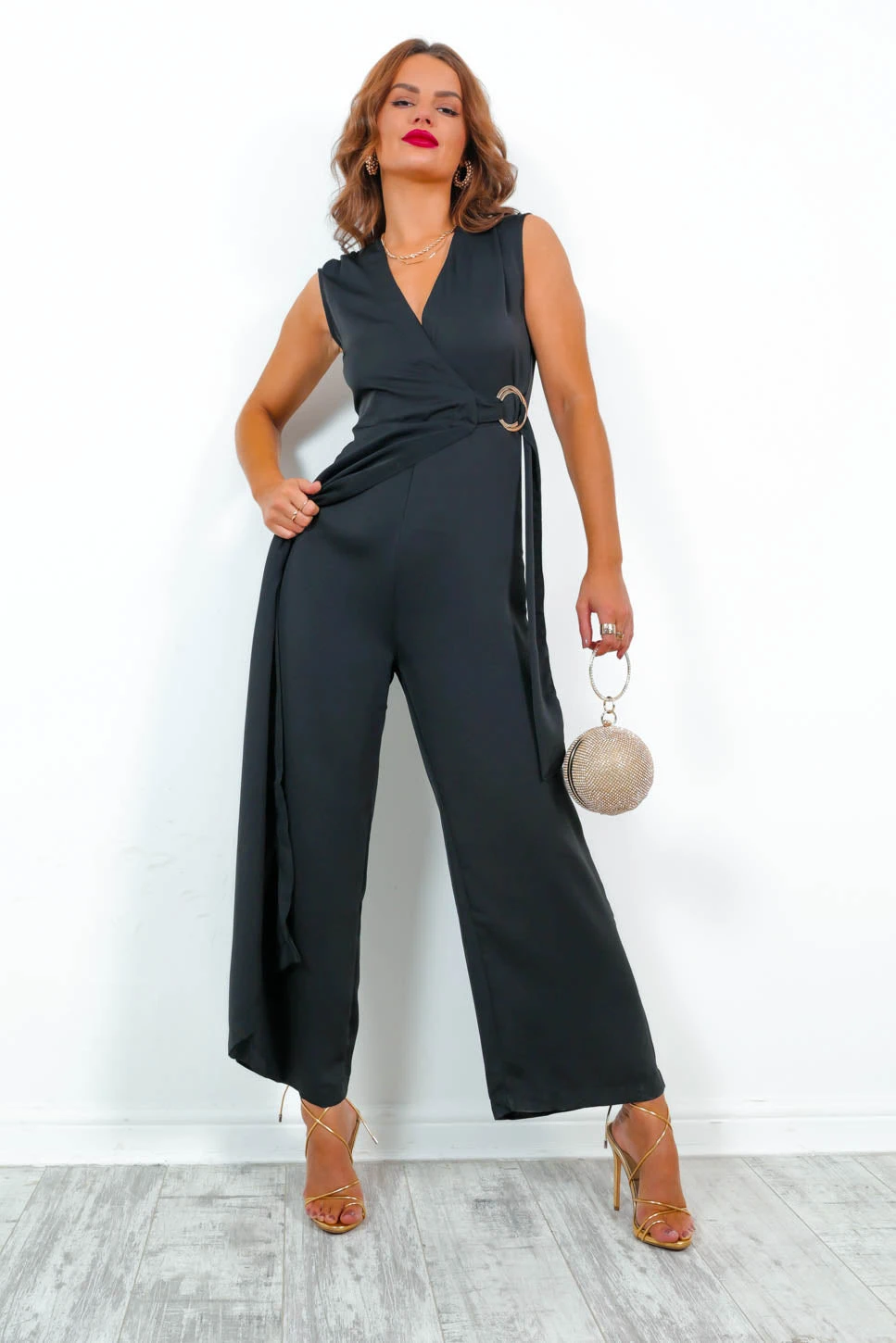Nail 9-5 dressing but make it fashion! This black jumpsuit features a wrap style detail with silver hoop fastening, V-neckline with sleeveless vest bodice and a wide-leg trouser. Ideal for those fashion-forward dolls or those who just love a jumpsuit! Style with cobalt heels and matching bags for boardroom-to-bar vibes.
