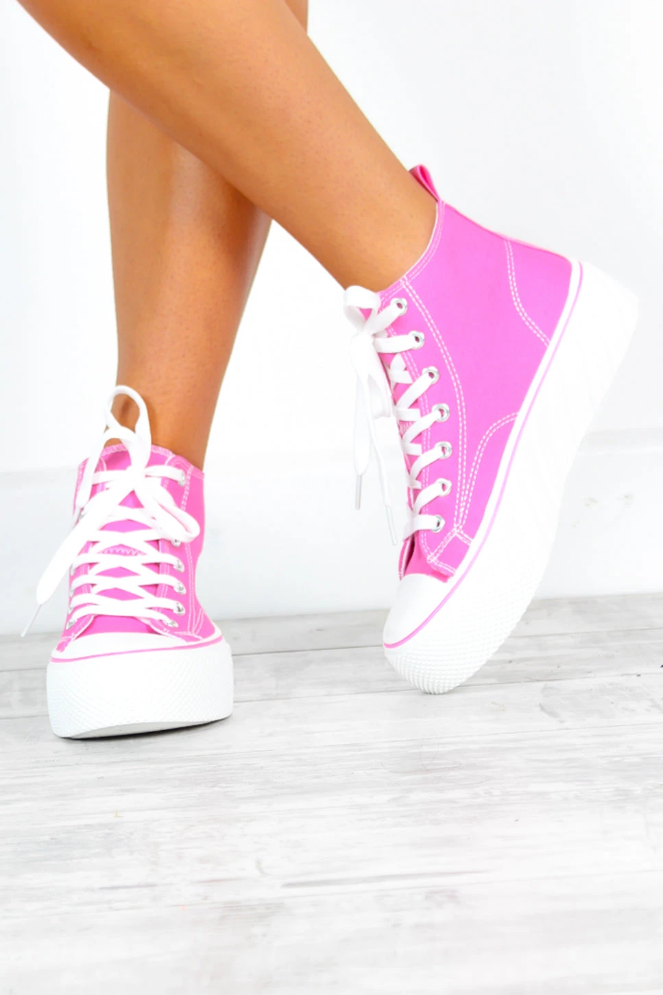 Don’t get caught out of step in the fashion game, Doll! Serve up stunning streetwear style in this season’s must-have platform high top trainers. In all-over barbie pink canvas with pavement pounding chunky platform sole and all the little textured details we’re obsessing over. Channel your inner Barbie girl in a floaty pink mini and a punchy pink shoulder bag for day drinks with your Doll squad!