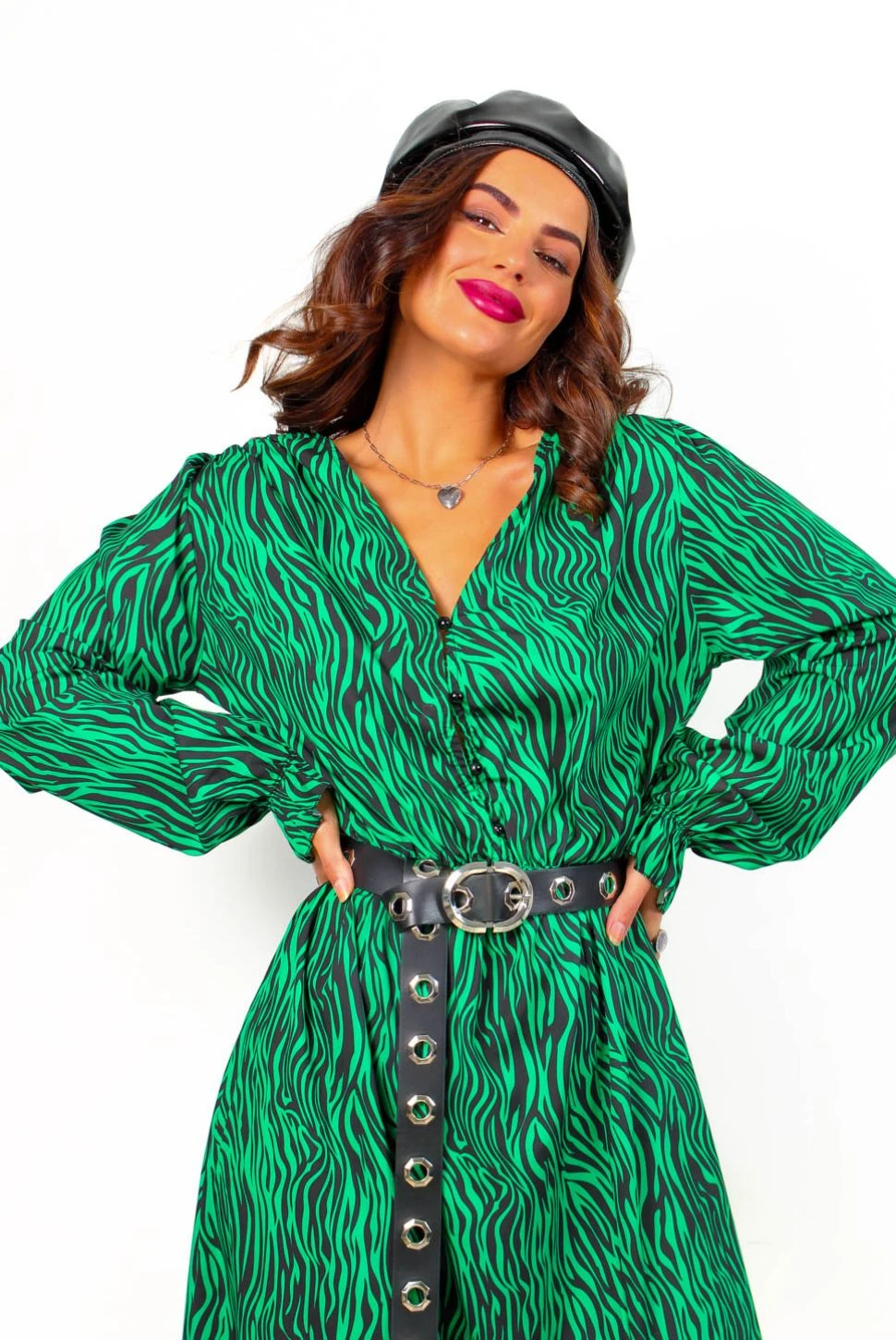 We’re going wild for this zebra number! This dress features a green animal print throughout, an elasticated waist, elasticated frilled long sleeves, a thigh split, button-down fastening, and a tiered bottom. Wear it to your spring picnic or dress it up for special occasions in pink heels!