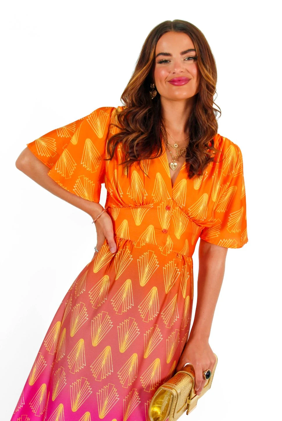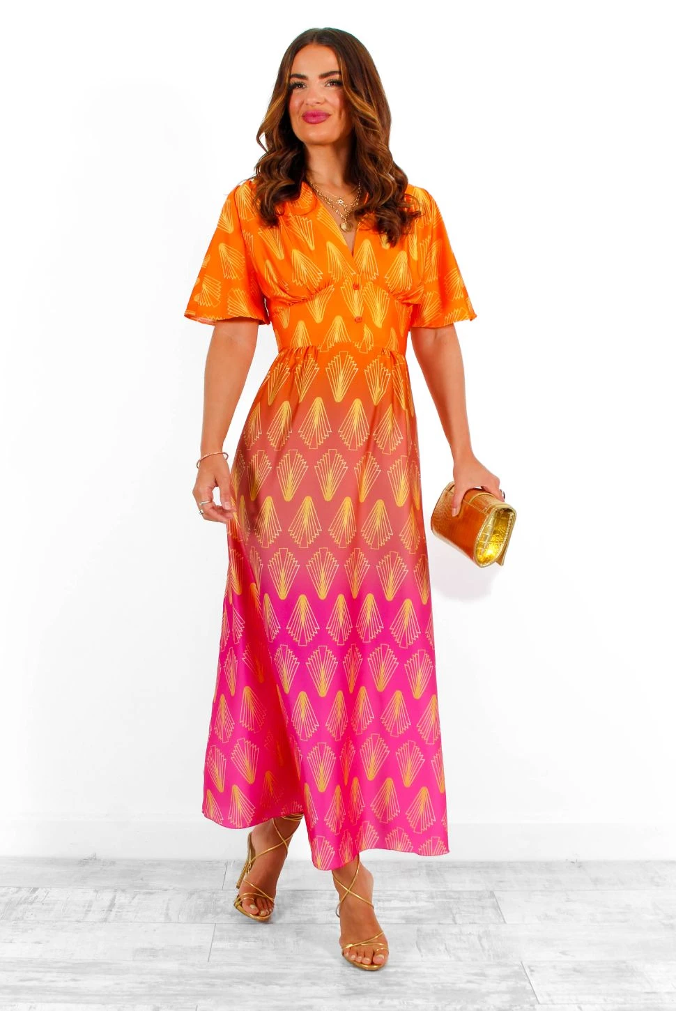 We’ve got places to be and sights to see, Doll! Turn heads in the ultimate holiday dress, this ombre maxi is perfect for fruity drinks in the sun or tapas by the marina. The buttoned waist detailing designed to snatch you in, paired with the flouncy sleeve, makes for the perfect flattering fit. Slip on some gold strappy heels and grab a matching clutch, and wait for the compliments to pour in!