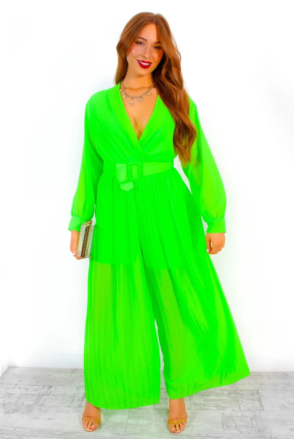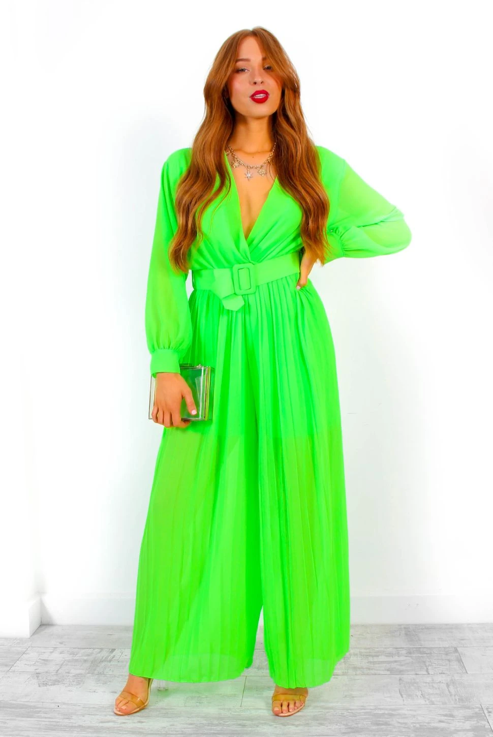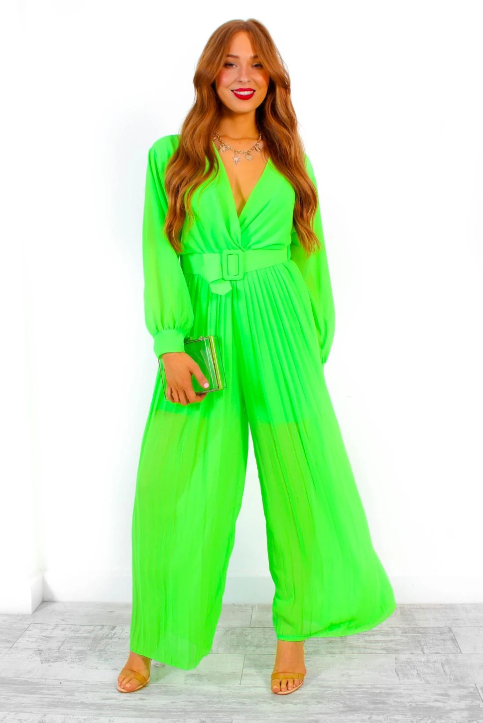 Always be seen in neon green! Featuring a plunging crossover neckline, long sheer sleeves and pleated fabric – we’re obsessed with this zesty neon number. The wide-leg fit makes this jumpsuit super comfy and wearable while the matching belt cinches your waist for a flattering silhouette. Look the utmost neon chic with a tousled up do, chunky gold jewellery and that glowy holiday skin on those holiday evenings.