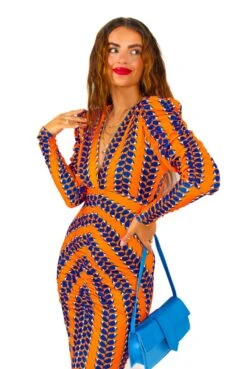 Id Want To Be Me Too – Orange Cobalt Print Plunge Ruched Midi Dress