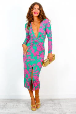Dont Make Me Wait – Green Fuchsia Floral Plunge Midi Dress