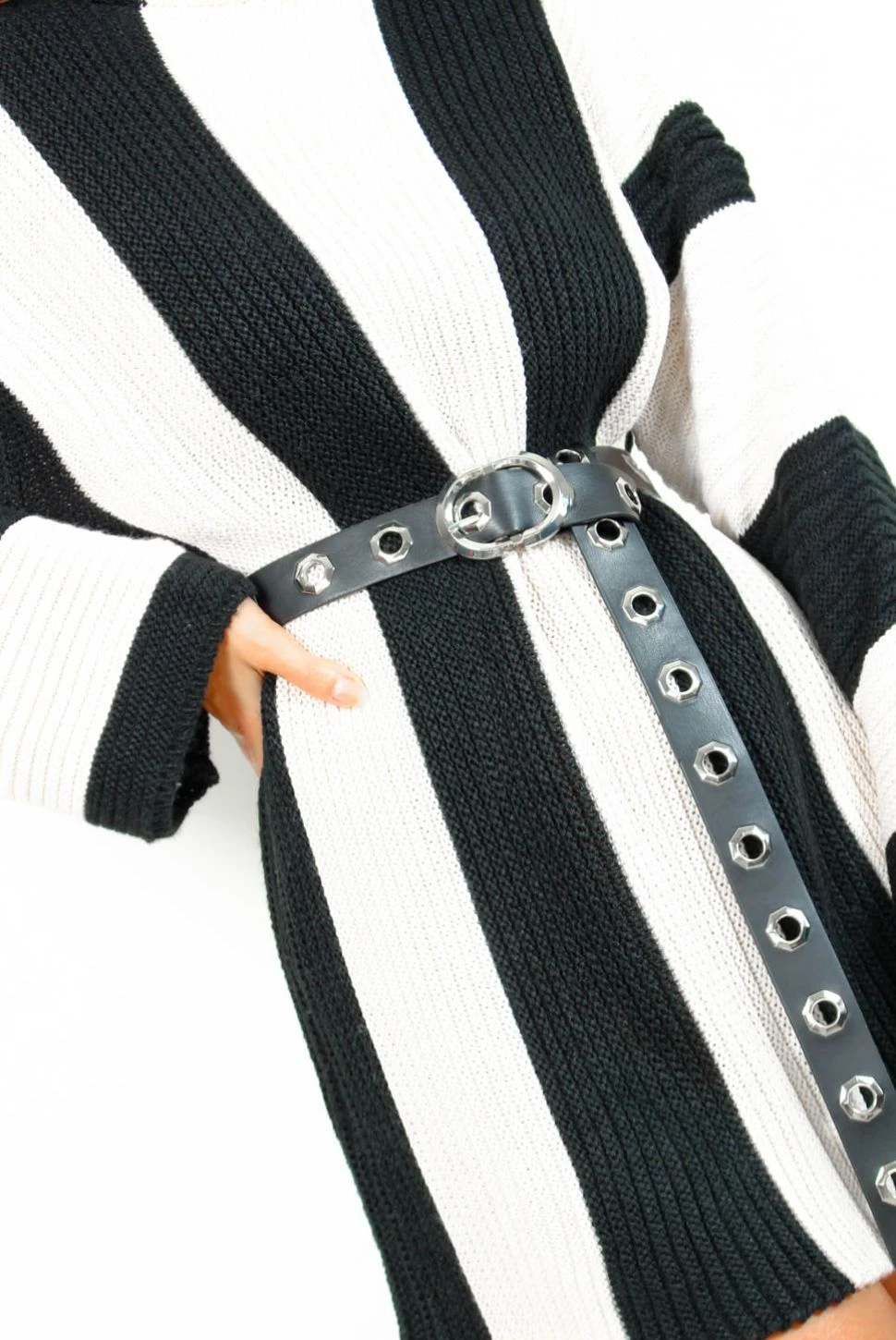 Add the perfect finishing touch to your outfit with this black faux leather belt. It features a silver buckle fastening, hardware details and eyelets throughout so super adjustable.. Add this to any outfit to take your look to the next level.