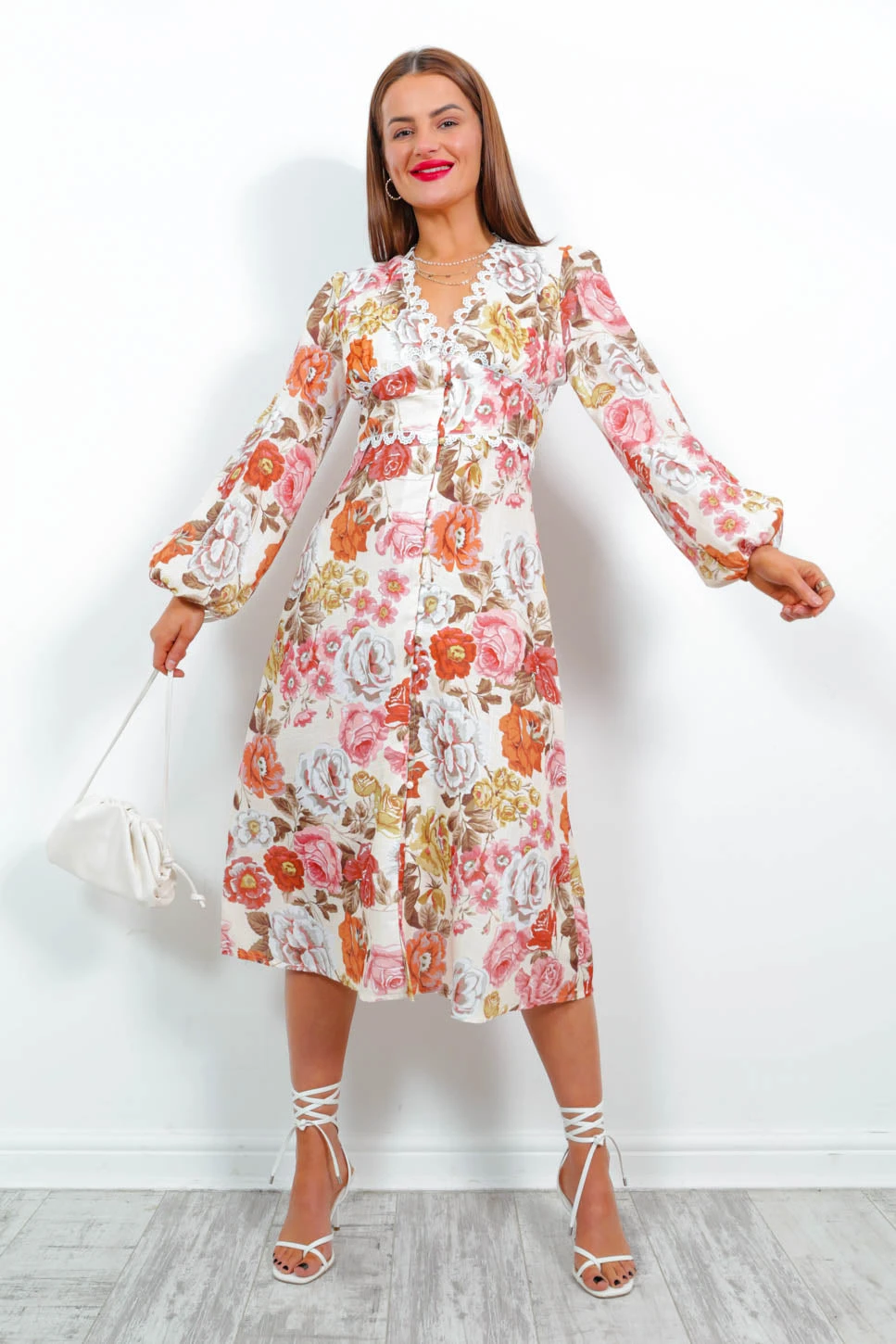 Whimsy meets chic in this romantic number. In a midi length, it features a cream base with oversized floral print in earth tones, lace detailing around the waist and neckline, fabric buttons down the front, and elasticated sleeves. Give it an edge in chunky boots and a black trench coat for spring vibes.