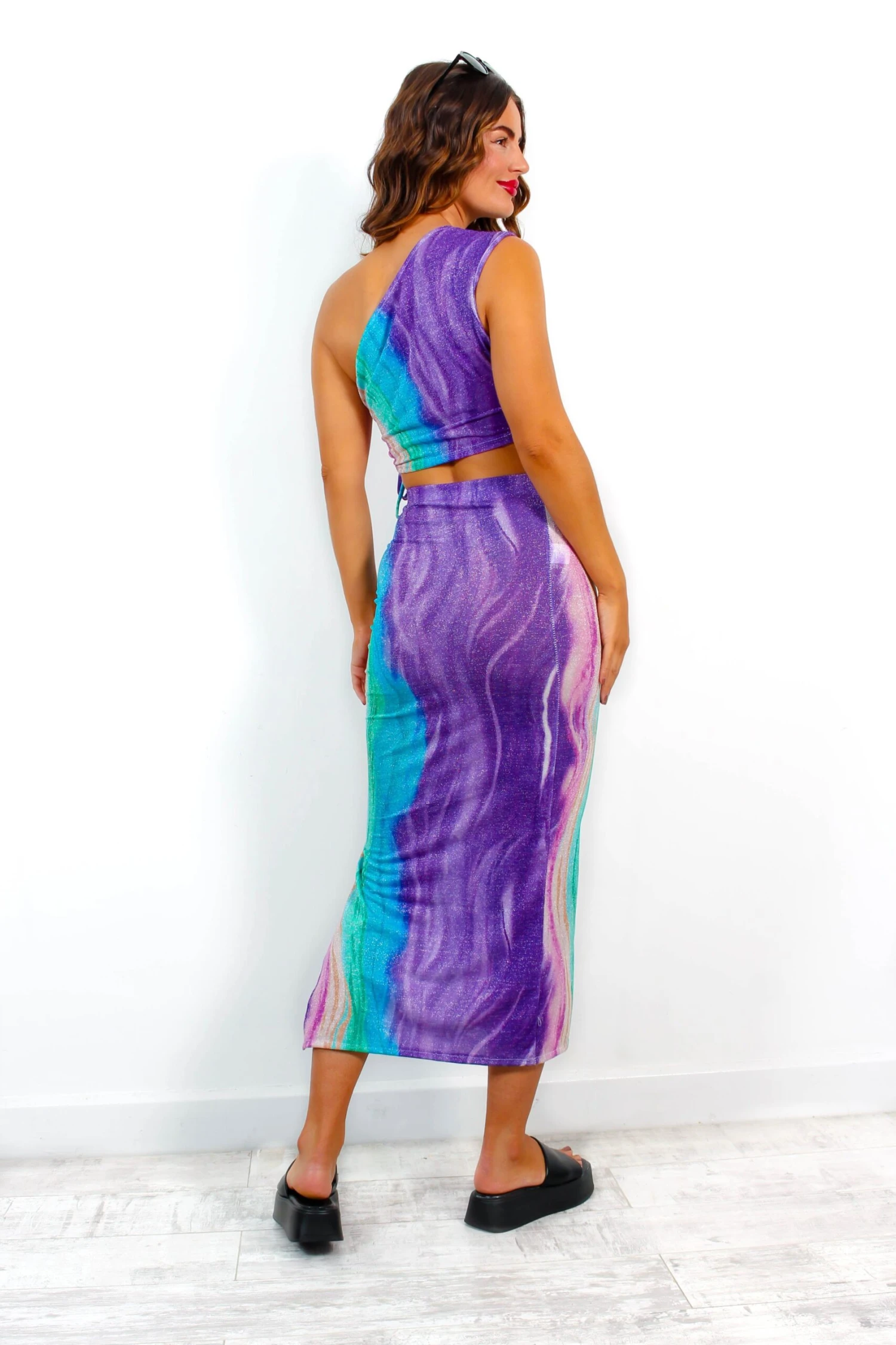 Step into the limelight and own the night with this party-ready co-ord. This stunning set is a dazzling display of purple perfection, featuring glitter lurex threads that sparkle with every move. The one-shoulder top adds a touch of sassy sophistication, paired with the matching high rise midi skirt which are both complete with ruching and a bodycon silhouette to enhance your curves and create a flattering fit. Pair with killer heels and a tousled up do and you’ll be the centre of attention on the dance floor.