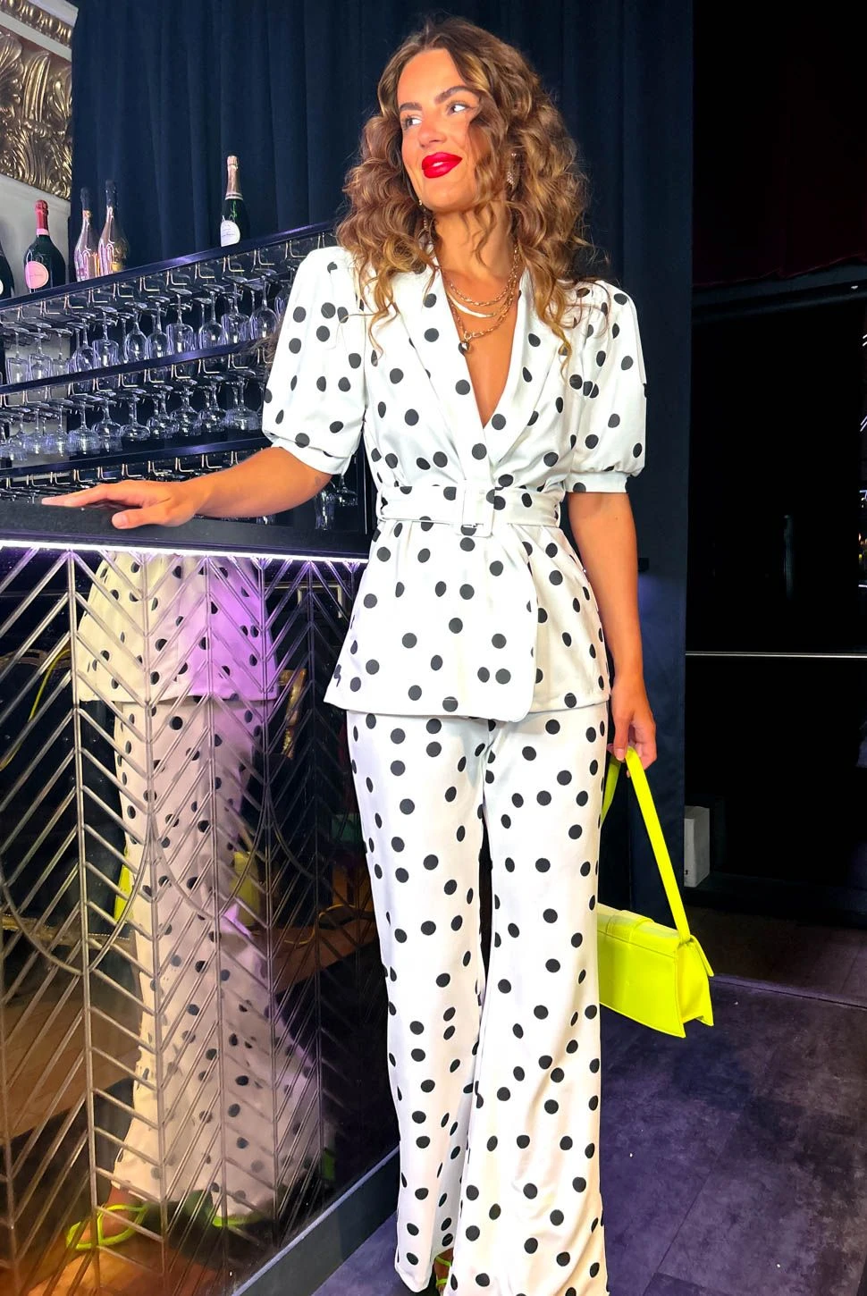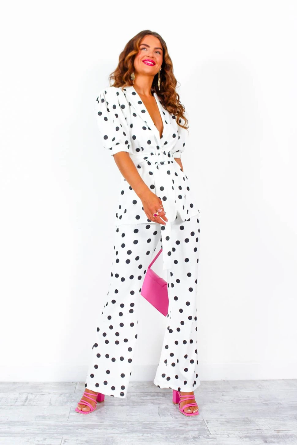 She’s got big ambitions and incredible style. Featuring a chic monochrome spot print and a fierce flared shape, these trousers come with an elasticated high waist for a comfortable and flattering fit. This stand out two piece also includes a wrap style top with a matching belt to cinch and shape and dramatic puffed sleeves for a look that’s totally on trend right now. For a flawless finish, add a pop of pink to your look.Â