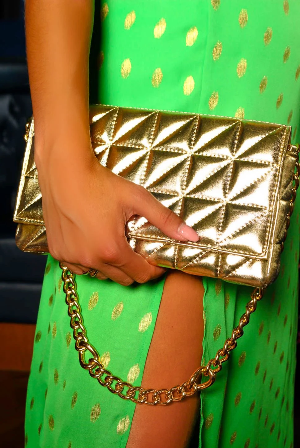 A gal can never have too many bags! This glimmering gold faux leather shoulder bag is quilted throughout with a magnetic button closure and chunky gold chain strap you can wear handbag or clutch style – whatever the vibe. Glow all night and add a luxe moment to your go to monochrome ‘fit.